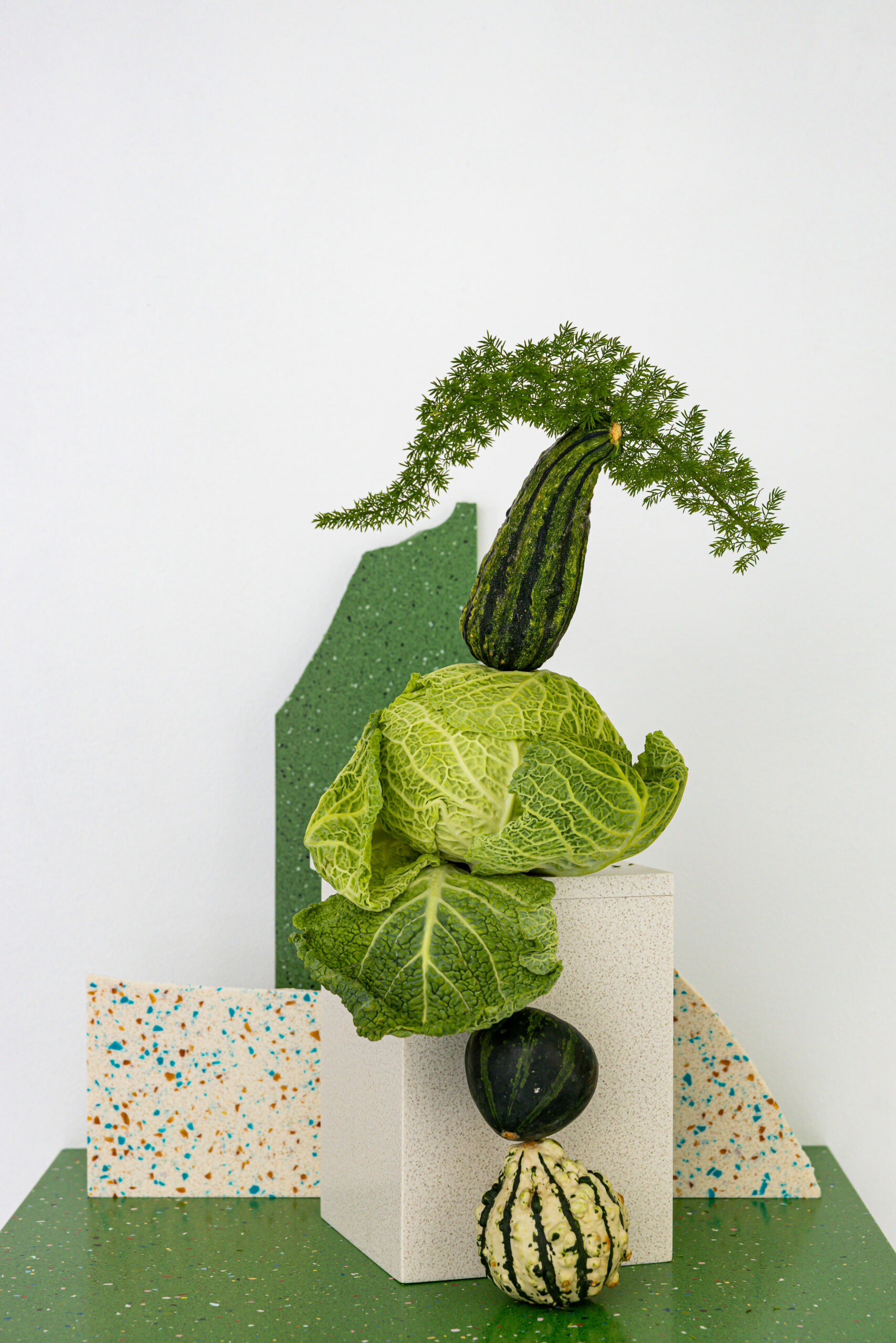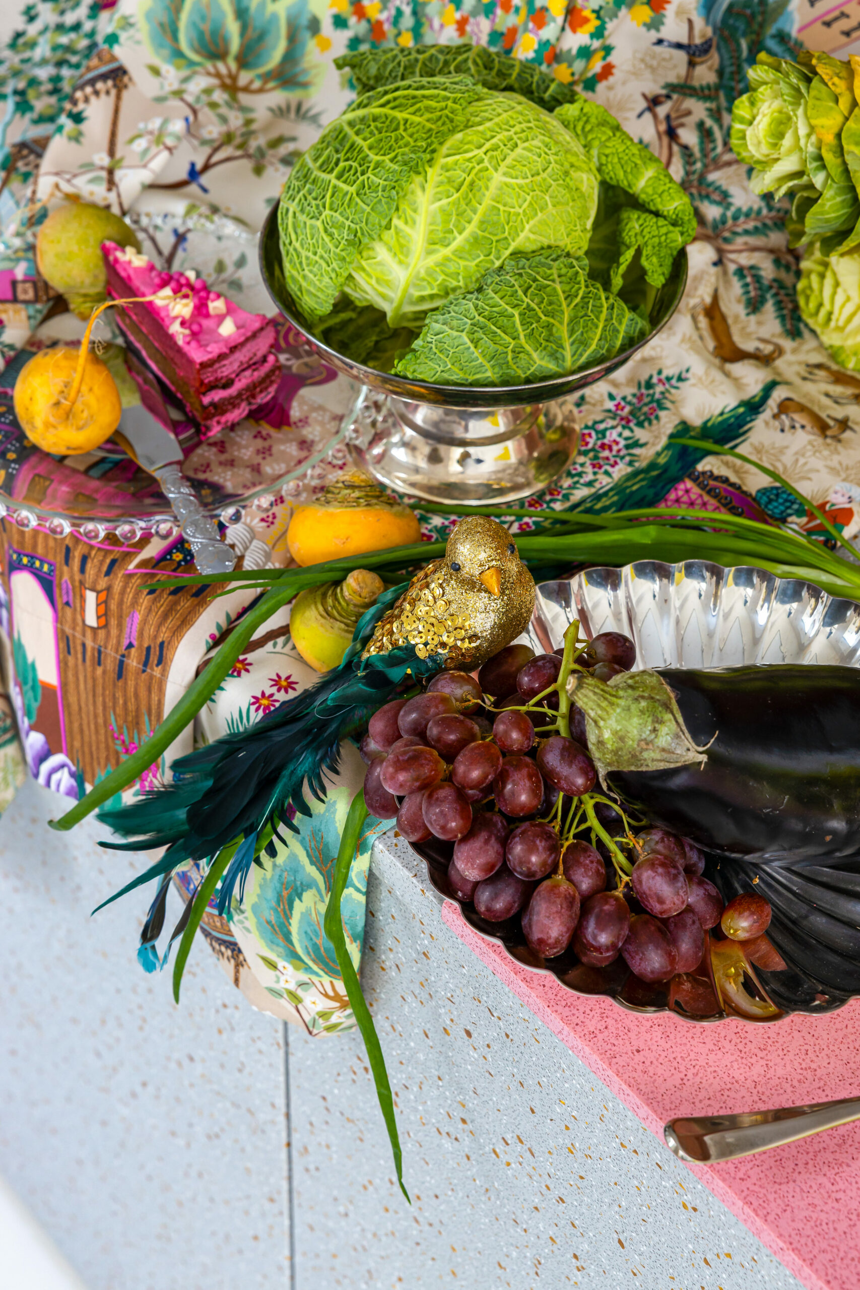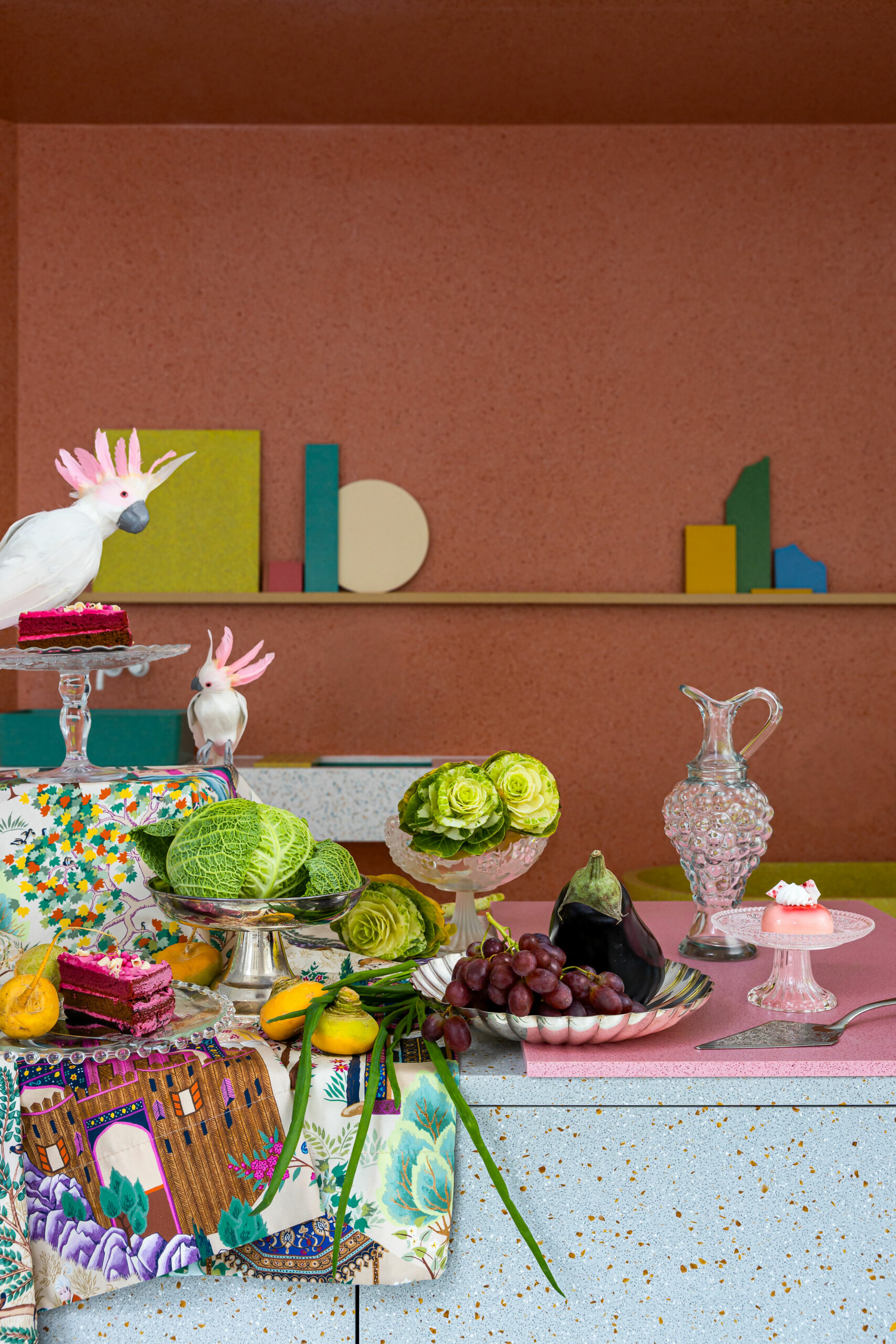 Kuvauspaikka Durat Showroom. Leyla by Manuel Canovas-kangas, Lauritzon. Astiat ja linnut, kuvausrekvisiittaa.