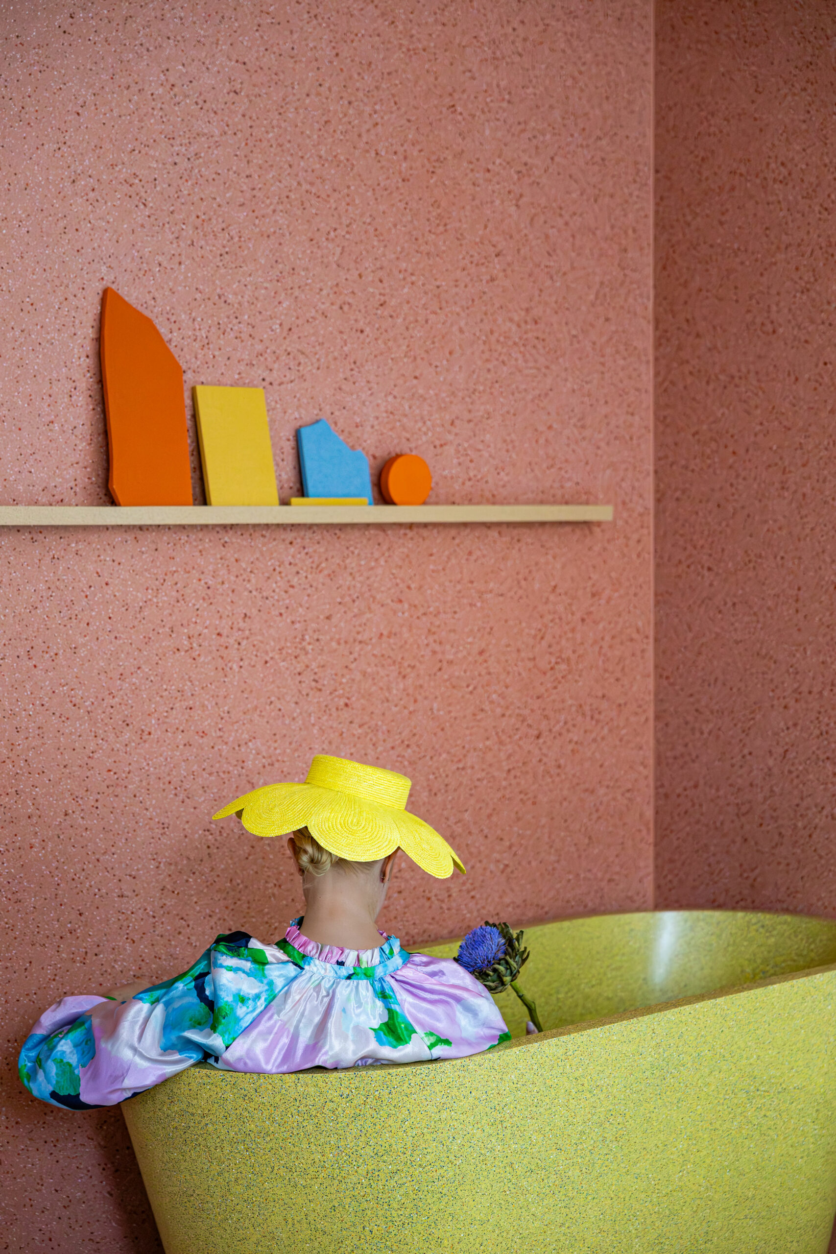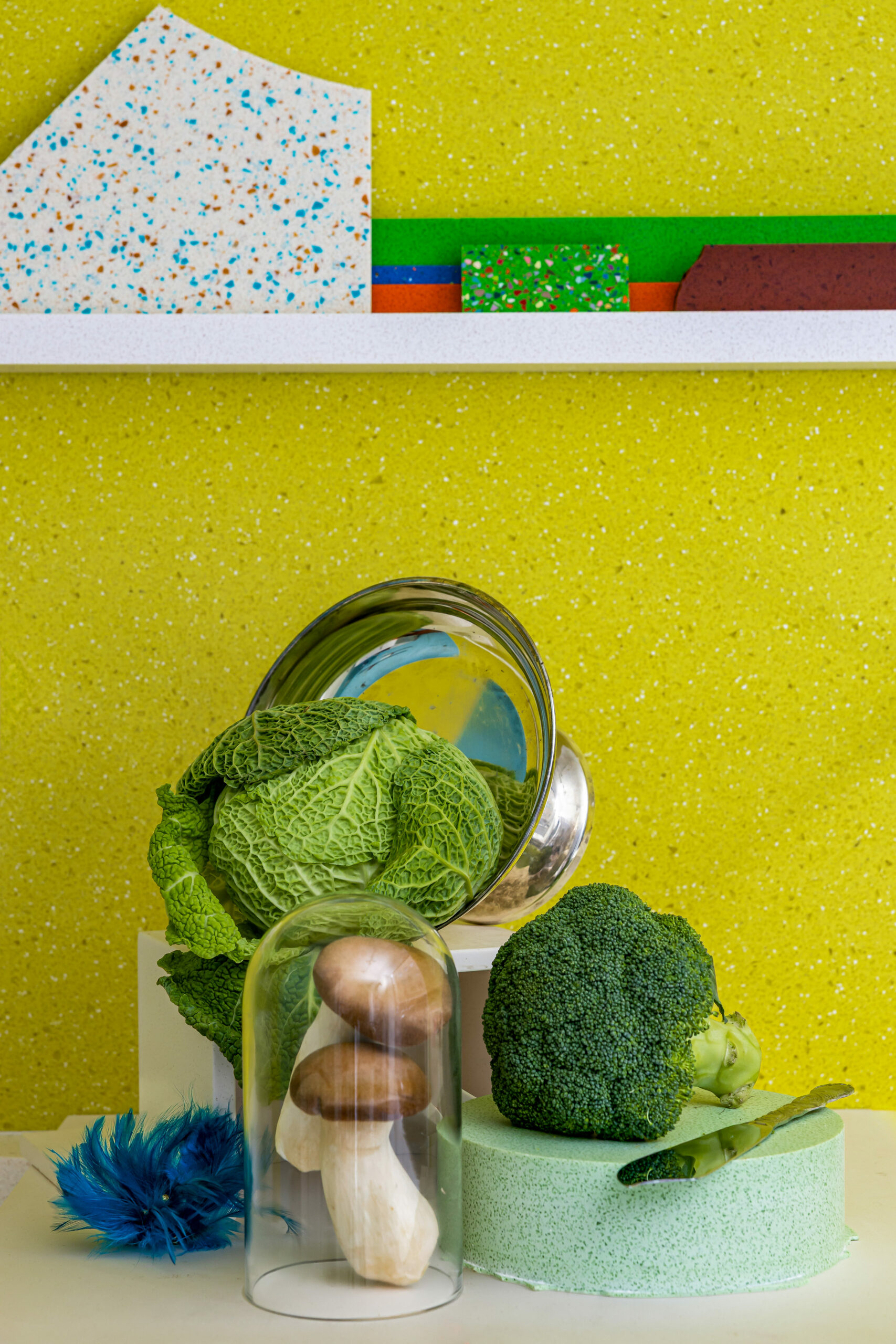 Värimaailma on lämmin, murrettu ja tarinallinen. Puuteriroosa, saven ja terrakotan sävyt sekä pehmeät vihreät muodostavat pohjan, jota rikastavat hillityt keltaisen, luumun ja metsänvihreän vivahteet. Pastellit eivät ole kevyitä tai viileitä, vaan syviä ja aavistuksen sameita – kuin ajan patinoimia. Värien välinen jännite tekee tilasta elävän ja moniulotteisen, hieman arvaamattoman mutta kutsuvan.