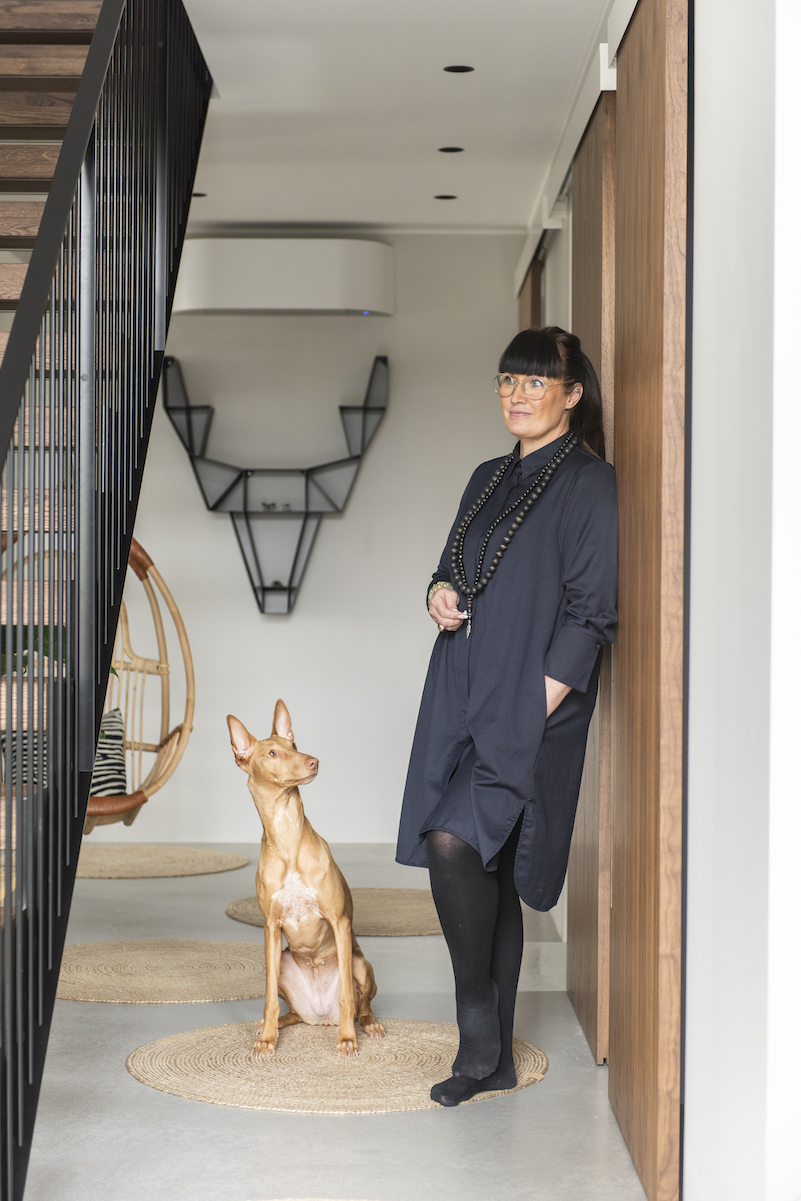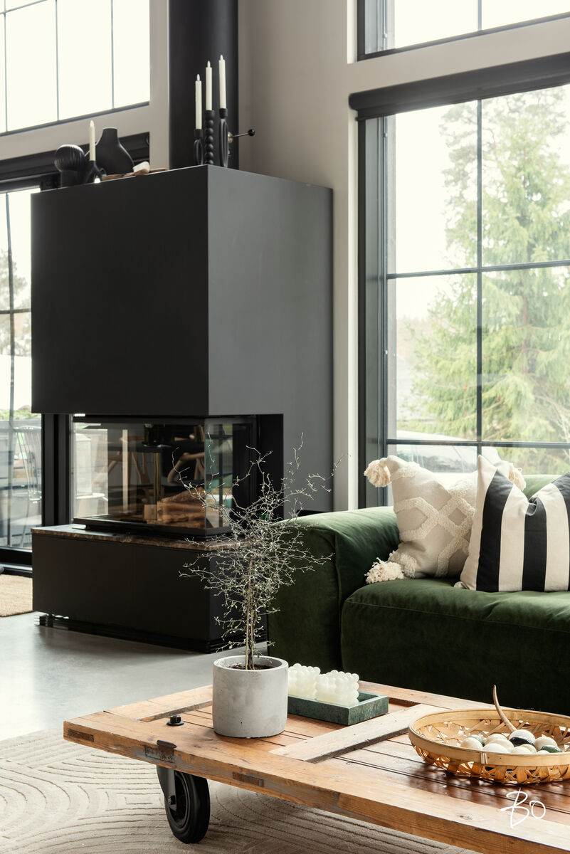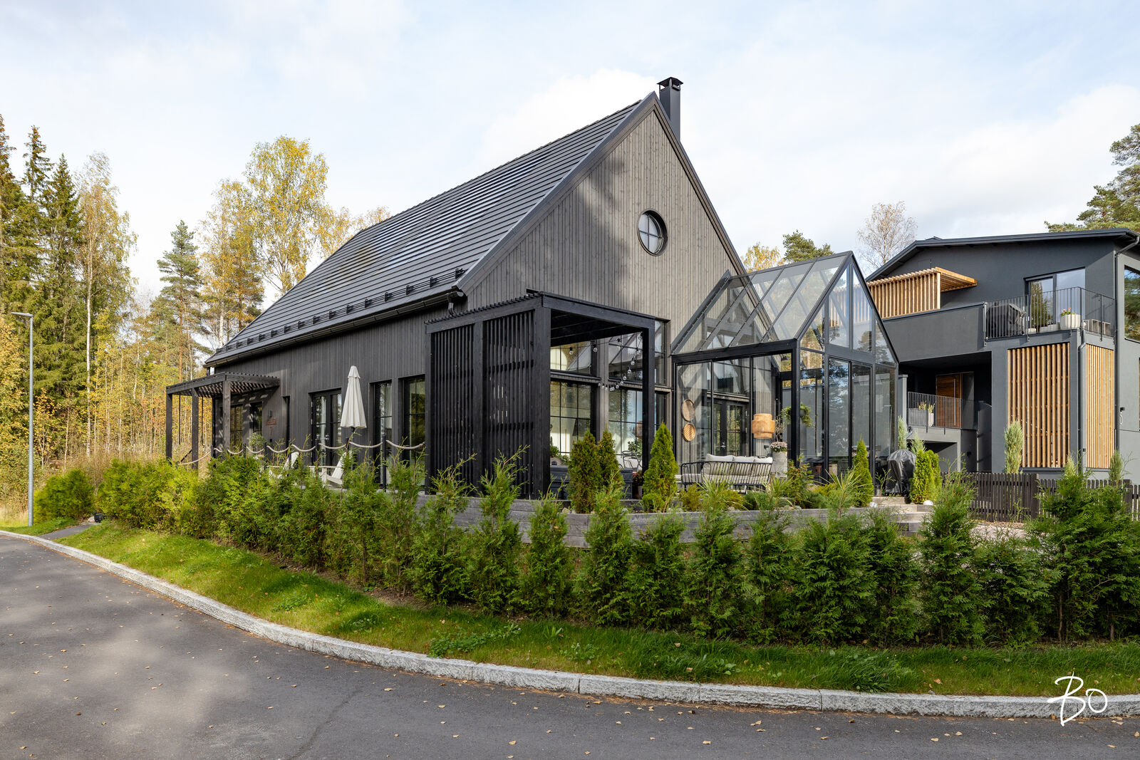 Etusivu / Blogi / Kodit / Karhusaaren helmi Bo Living Kodit 20.10.2025 Karhusaaren helmi Luonnonläheisen tien varrella ja vasta rakennetun kadun päässä Karhusaaressa Helsingissä nousee komea musta talo. Rakennusprojekti oli perheelle jo toinen. Sisustussuunnittelija, ammattirakentamisen asiakasvastaava Nuran Samaletdin on suunnitellut talon alusta loppuun itse ja talon toteutti Designtalo. Täysin itse suunnittelussa kodissa on paljon erilaisia omia ratkaisuja, paljon kaunista nähtävää, herkullisia värejä ja kiinnostavia pintoja. Avaran olohuone-ruokailutilan koko on n. 46 m2 ja huonekorkeus on parhaimmillaan n. 7 m. Olohuoneen sisustus on pelkistetty, mutta pääelementit siinä ovat muhkeita ja mukavia. Koko talossa on koira- ja lapsiystävällinen rouhea betonilattia, joten iso matto tuo pehmeyttä tilaan. -Sijainnissa hurmaa luonnonläheisyys, riittävän ilmava tontti, jossa ei rajoittavaa tai ohjaavaa asemakaavaa, hyvät yhteydet lasten kouluihin ja palveluihin. Halusimme päästä vaikuttamaan talon ulkomuotoon ja julkisivuun, saada siitä omannäköisen ja täysin omiin tarpeisiin sopivan. Toiveissa oli selkeä linjainen talo, jyrkkä harjakatto, pystyverhoilu, musta julkisivuväri, isot ruutuikkunat ja kirsikkana kakun päällä pyöreä ikkuna harjan alla. Halusimme talosta kaksikerroksisen siten, että osa olisi korkeaa avointa tilaa. Pohjalta haimme selkeyttä ja avaruutta. Pidämme ruuanlaitosta ja kutsumme mielellämme ystäviä kylään. Ruokapöydän ääressä ilta venyy helposti pikkutunneille, joten meille oli tärkeää suunnitella keittiö toimivaksi. Ruuanlaiton pitää sujua luontevasti seurustelun lomassa. Pariskunta halusi panostaa keittiön toimintoihin, käyttökelpoisuuteen ja visuaaliseen puoleen. Yläkaapiton keittiö on kevyt ja minimalistinen, mahdollisimman ”ei-keittiömäinen”, koska se on avoimessa tilassa olohuoneen kanssa. Kaikki keittiön kaapit ovat jaloilla ilman sokkelia. Näin ilme säilyy keveänä. Kaapit ovat supermattavalkoiset. Korkea seinään upotettu kaappirivistö kätkee täyskorkean kylmäkoneen, aamiaiskaapin, uunit ja käynnin pantryyn. Keittiö on Novartin mallistosta. Keittiön metalliväri on messinki. Kaunis ruskea taso on Emperado dark-marmoria, joka hiottiin mattapintaiseksi. Valaistus on suunniteltu keittiön tason päälle kiskolla, joten valaisten paikat eivät ole tiukkaan sidotut. Talo on sovitettu luontoon ja ympäröivään maisemaan. Taloa ja tiloja suunnitellessa tärkeää oli auringon kulku. Tällä kertaa oli mahdollista saada lähes kaikki sisustustoiveetkin toteutukseen, joten pohjaratkaisuista löytyykin nyt ruokakomero, kuntoilutila, kotispa jossa amme maisemaikkunan edessä ja lastenhuoneet harjakaton alla. -Tyylini on selkeä, mutta ei paljas. Rakastan kodikkaita elementtejä kuten puupintoja, sävykkäitä pintoja ja tekstiilejä, erityisesti mattoja, taljoja ja turkiksia. Tässä kodissa halusin hyvin luonnonläheisiä materiaaleja ja sävyjä, ollaanhan luonnon keskellä. Materiaaleina meillä on puuta, kiveä, betonia, villaa ja mustaa metallia. Puupinnat ovat vaihdellen rimaa ja paneelia mielenkiinnon ylläpitämiseksi. Värit meillä ovat maanläheisiä murrettuja sävyjä: greigea, luonnonvalkoista ja ruskean sävyjä ihan tummanruskeaan asti. Tehosteena ripaus mustaa ja messinkiä. Portaat ovat keskellä taloa isossa eteisaulassa ja näkyvät heti sisääntullessa, joten niiden piti olla näyttävät. Gradon portaiden askelmat ovat tammea ja ne on sävytetty pähkinään sopivaksi. Niissä on myös valaistus. Takka haluttiin keskeisellä paikalla, jotta se näkyy mahdollisimman laajasti eri tiloihin ja on kirjaimellisesti talon sydän. Sen sijainti oli mielessä jo ennen kuin itse projekti alkoi. -Kodin sisustajana olen pitkäjänteinen. Tähän kotiin hankimme vain sohvan ja joitakin mattoja uutena, muut kalusteet siirtyivät edellisestä kodista.Ne hankittiin jo aikoinaan kestämään aikaa ja käyttöä. Kalusteiden suhteen perhe pitää erityisesti design kalusteista ja mieluusti klassikoista. Näitä pysyviä aarteita onkin kotiin kertynyt matkan varrella pikku hiljaa. Suomessa kun on suurin osa vuodesta pimeää, halusimme panostaa myös valaistukseen. Suunnittelimme itse valaistuksen ilmeen, tarpeet ja tyylin. Mietimme paljon eri tilojen tunnelmaa, missä tarvitaan työvaloa ja missä tunnelmavaloa. Valon värilämpötila on myös tärkeä, kaikki tilat on suunniteltu samalla värilämpötilalla ja valon voimakkuus on säädettävissä lähes joka tilassa. Makuuhuoneen ja oleskelutilojen välissä on lasiovet, joissa on raitalasia. Läpinäkyvyys ja ilmavuus säilyy, mutta ovista ei näe selvästi läpi. Makuuhuone on hotellimainen tila, jossa on seesteinen ja rauhallinen tunnelma. Materiaalit ovat luonnonmukaisia. Väliseinän takana on walk trough closet. Sängyn takana olevassa väliseinässä oleva hyllyratkaisu on pähkinäviilusta. Hyllyssä on myös sähköt, koska tilaan ei mahdu yöpöytiä. Kodin kylpyhuoneeseen oli toiveena saada runsaasti tilaa, valoa ja avaruutta niin, että tilassa todellakin viihdytään muutenkin kuin tarpeellisen verran. Tästä tilasta haluttiin luoda spahenkinen tila rentoutumiselle, paikka missä voisi nauttia vaikka joogahetkestä ennen kuumaa kylpyä. Yläkerran arkiolkkarissa on myös vierasmajoitus ison sohvan avulla ja Nuranin pieni työpiste. Teksti Piia Kalliomäki, kuvat Pauliina Salonen. Kohdetta välittää Katariina Ahlbäck.