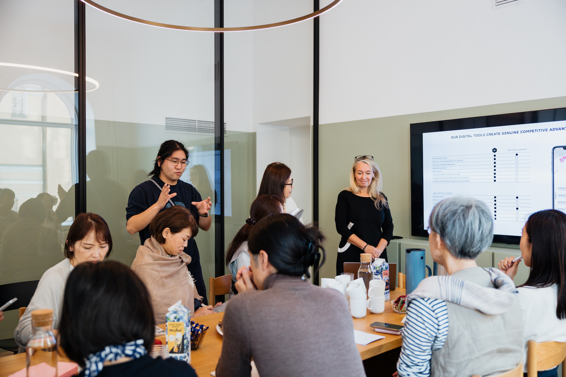 Työmatkallaan Helsinkiin vieraat halusivat nähdä paitsi kauniin Bo-toimistosisustuksen, myös oppia lisää työhyvinvoinnista ja työ- ja yksityiselämän tasapainosta. Bon toimitusjohtaja Saara Murtovaara otti vieraat vastaan, piti kattavan esityksen yrityksen liiketoiminnasta sekä itsekin Japanista pitävänä vastasi vieraiden runsaisiin kysymyksiin elämästä Suomessa.