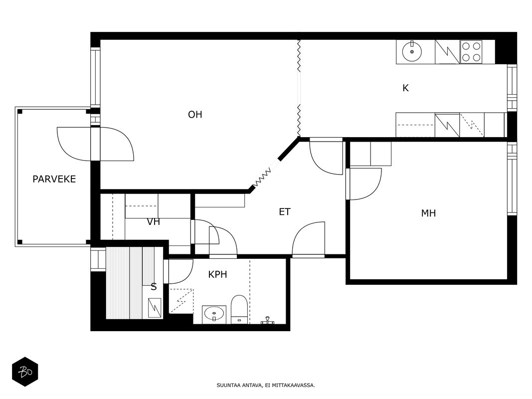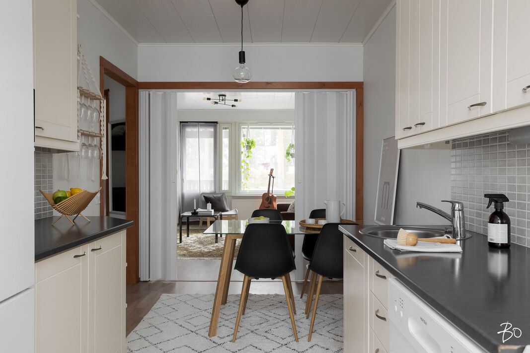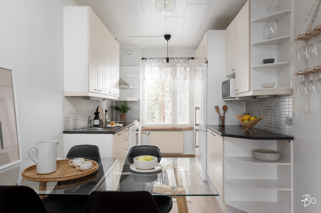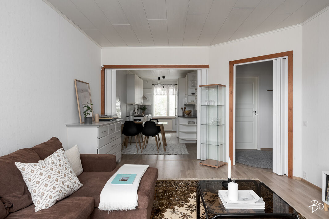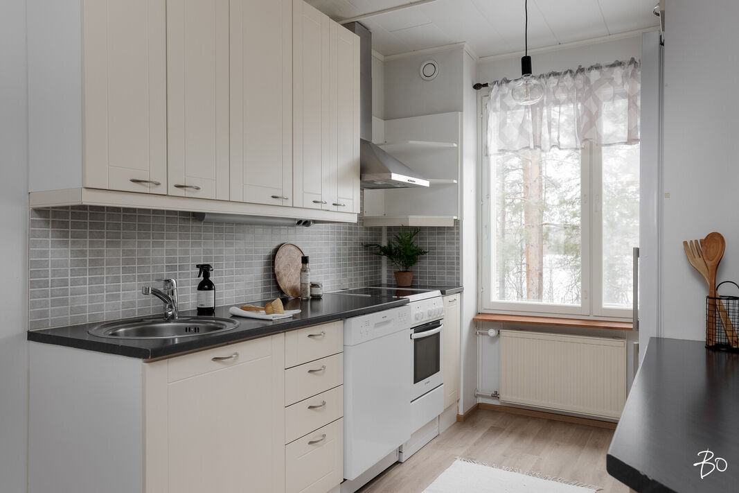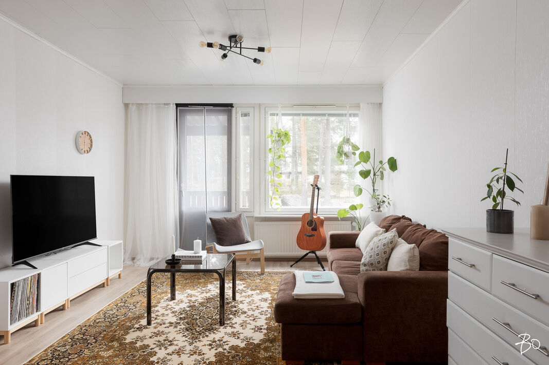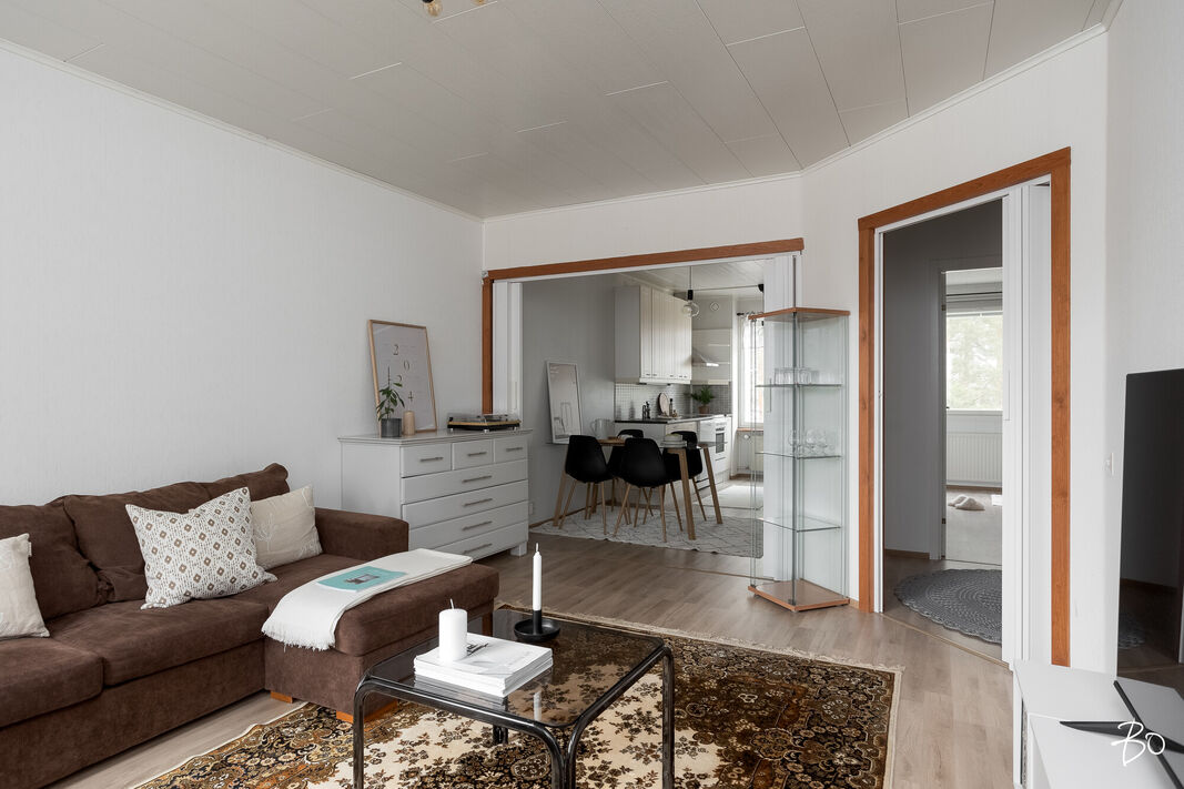 Tämä lämminhenkinen koti koostuu kahdesta huoneesta, keittiöstä ja saunalla varustetusta kylpyhuoneesta. Asunnon pohjaratkaisu on erittäin toimiva ja tilava; huoneet sekä erillinen keittiö antavat mukavasti yksityisyyttä. Olohuone on avara ja valoisa, suuret ikkunat tuovat runsaasti valoa sisään. Olohuoneesta löytyy myös käynti asunnon parvekkeelle, joka tarjoaa avaran näkymän metsäiseen maisemaan. Kaiken tämän lisäksi kodista löytyy oma sauna, joka luo täydelliset puitteet rentoutumiselle raskaan päivän jälkeen.