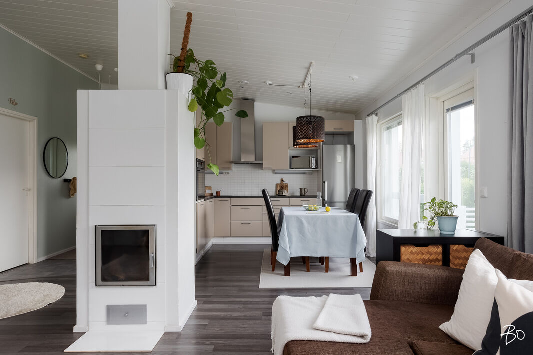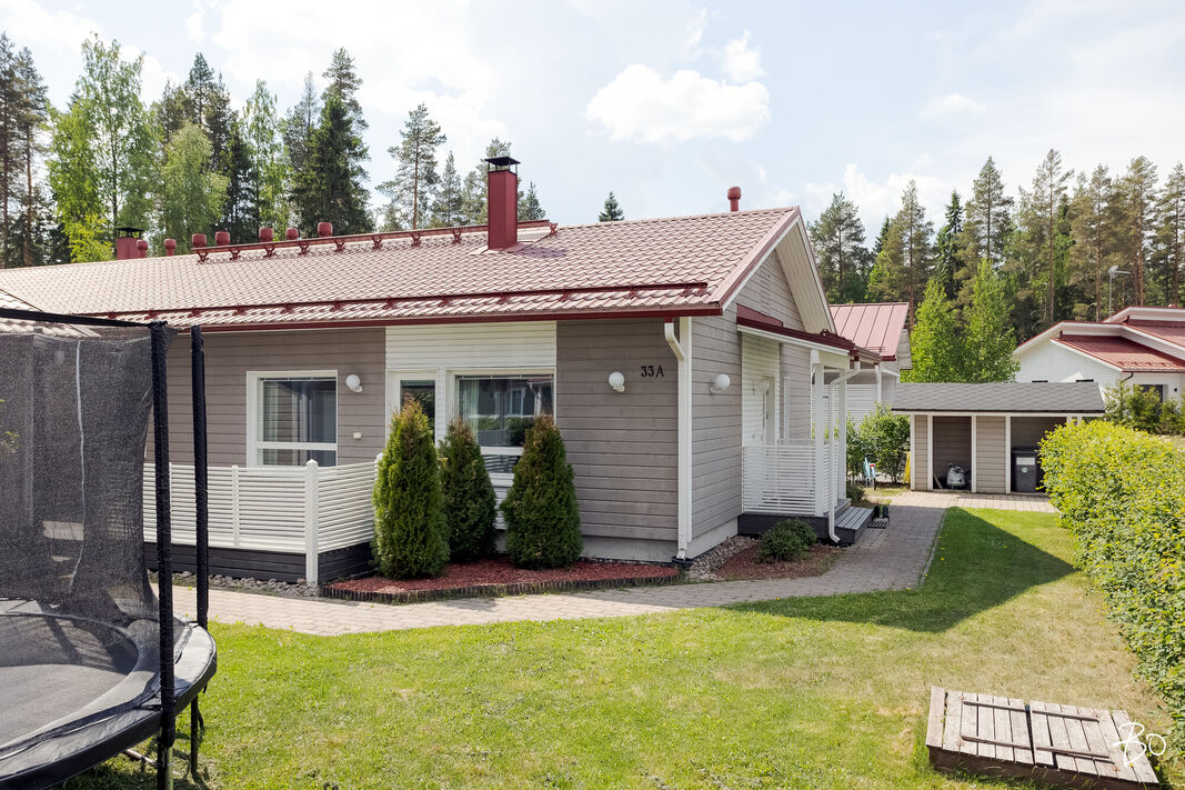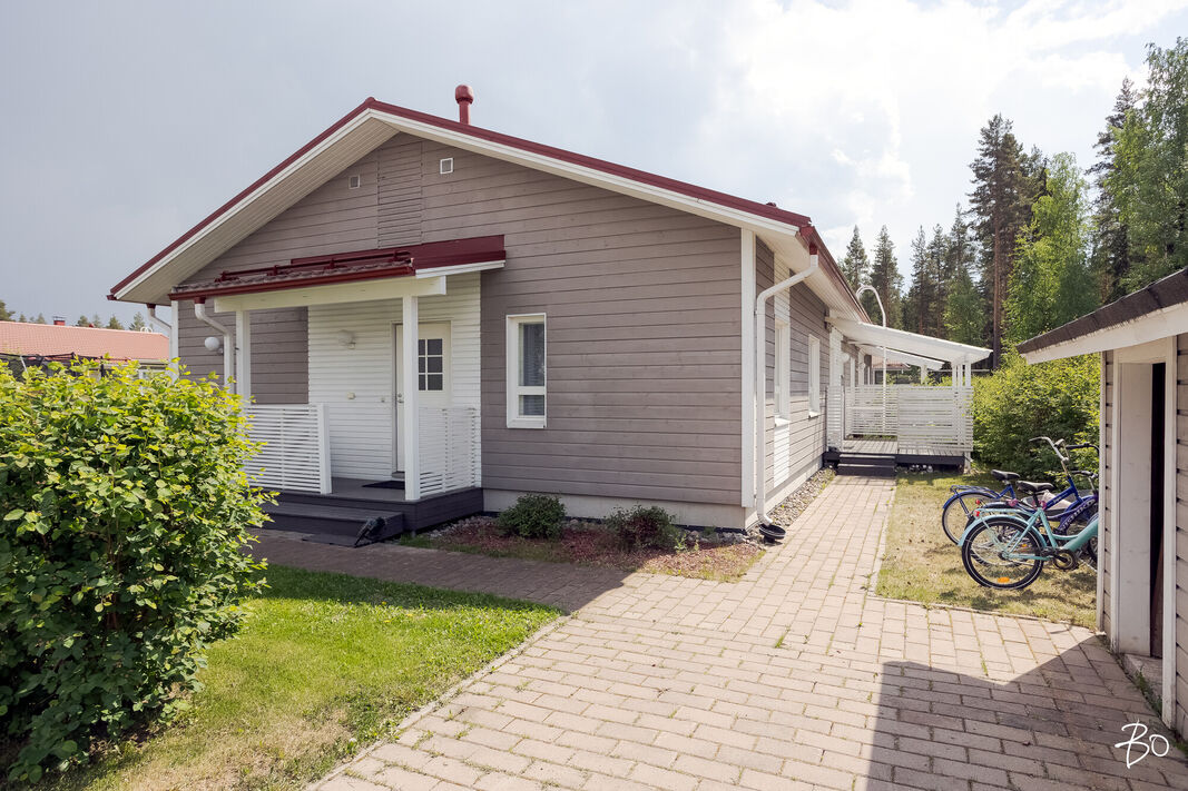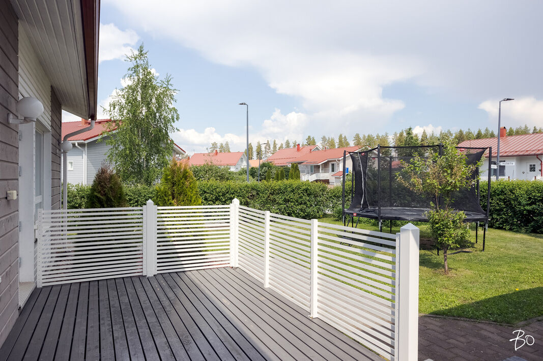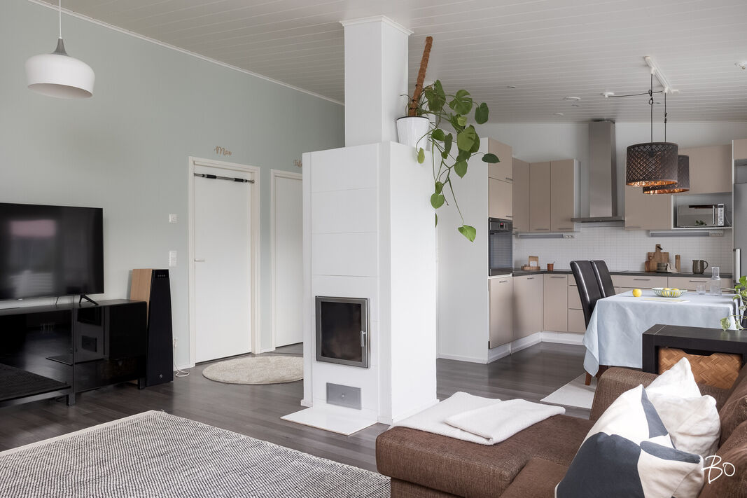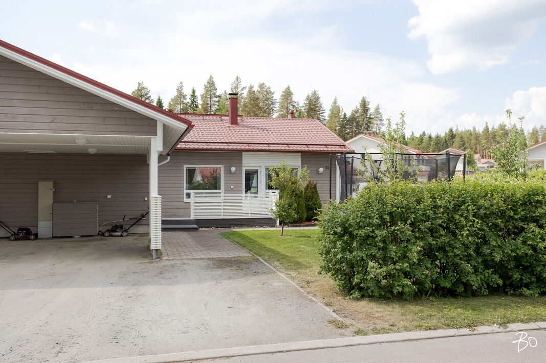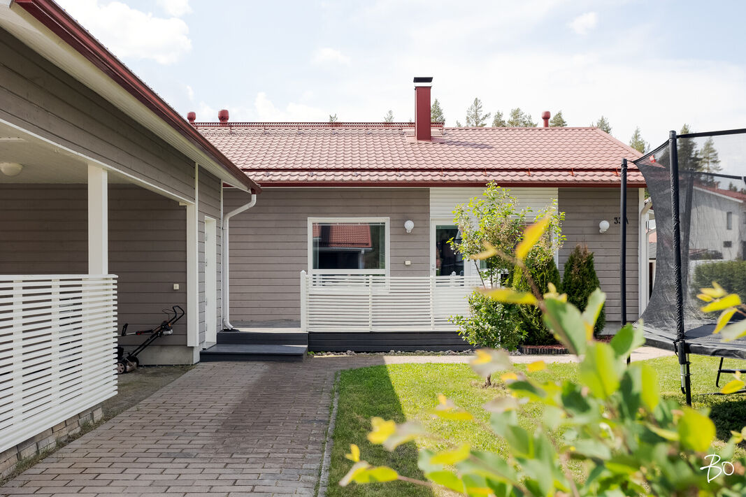 Tässä v. 2012 valmistuneessa kodissa on kolme makuuhuonetta, jossa yhdessä makuuhuoneessa on vaatehuone. Yksi makuuhuone on käytännöllisesti erillään kahdesta muusta makuuhuoneesta. Avara keittiö-olohuonetila, jossa on tunnelmaa luova takka. Olohuoneesta on kulku aurinkoiselle terassille ja piha-alueelle Piha-alueella on tasaista nurmettua aluetta, johon mahtuu näppärästi esimerkiksi trampolini. Valmiita istutuksia löytyy myös pihasta. Kylpyhuone, sauna ja kodinhoitotila ovat kivasti erillään muista tiloista ja kodinhoitohuoneesta on kulku toiselle asunnon terasseista.