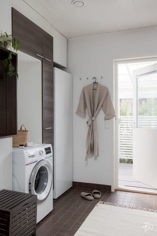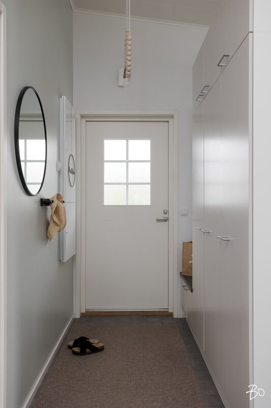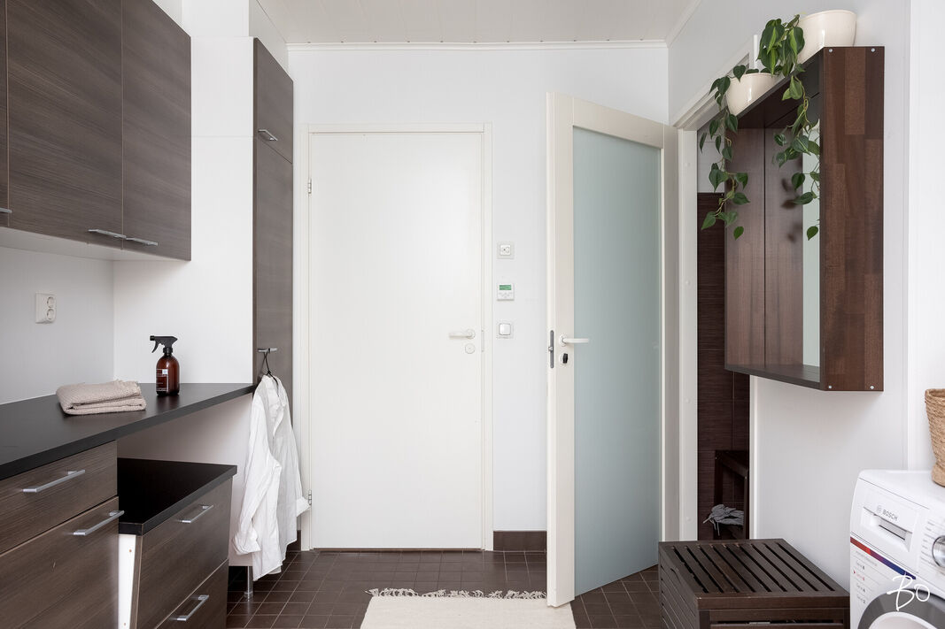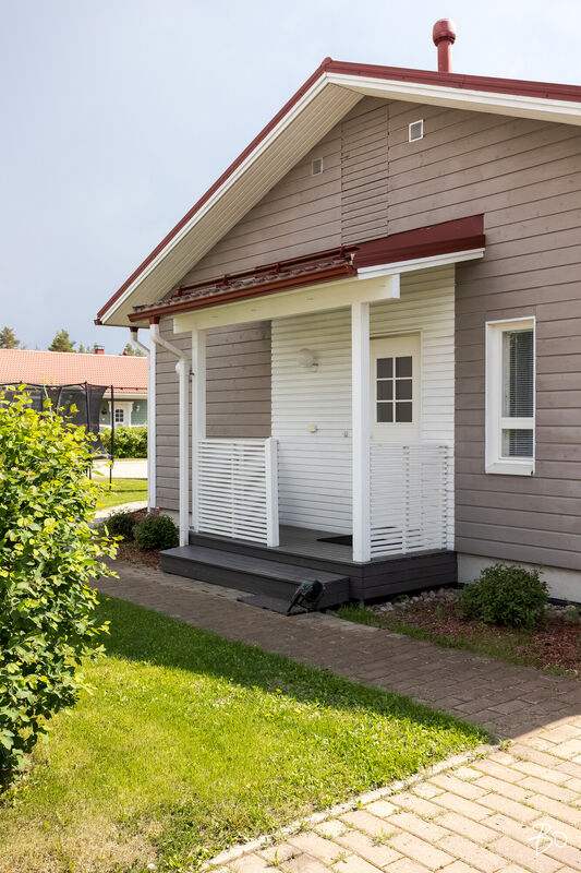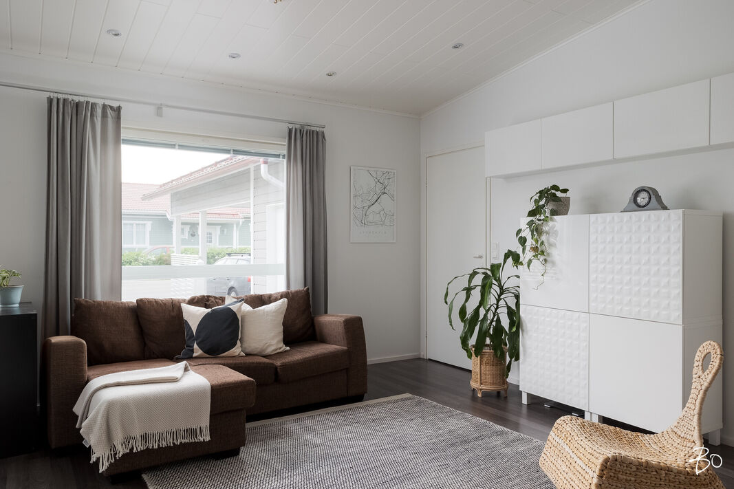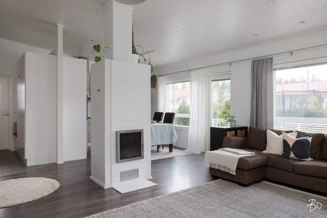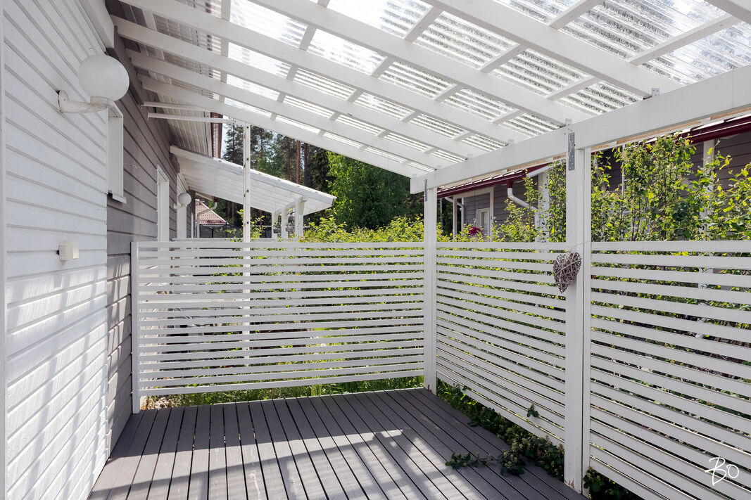 Tässä v. 2012 valmistuneessa kodissa on kolme makuuhuonetta, jossa yhdessä makuuhuoneessa on vaatehuone. Yksi makuuhuone on käytännöllisesti erillään kahdesta muusta makuuhuoneesta. Avara keittiö-olohuonetila, jossa on tunnelmaa luova takka. Olohuoneesta on kulku aurinkoiselle terassille ja piha-alueelle Piha-alueella on tasaista nurmettua aluetta, johon mahtuu näppärästi esimerkiksi trampolini. Valmiita istutuksia löytyy myös pihasta. Kylpyhuone, sauna ja kodinhoitotila ovat kivasti erillään muista tiloista ja kodinhoitohuoneesta on kulku toiselle asunnon terasseista.