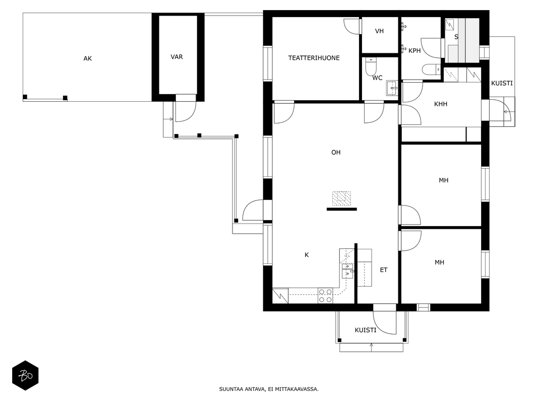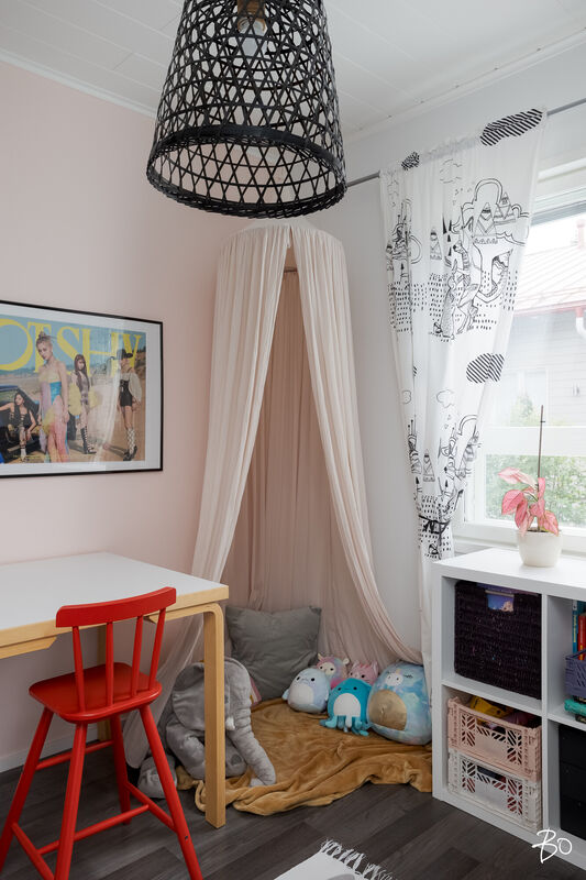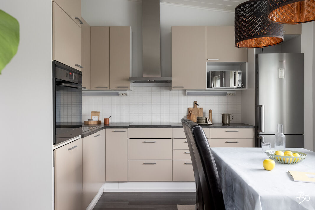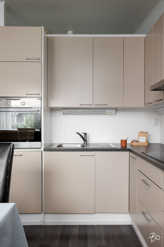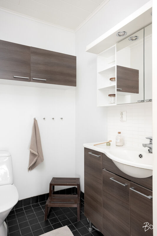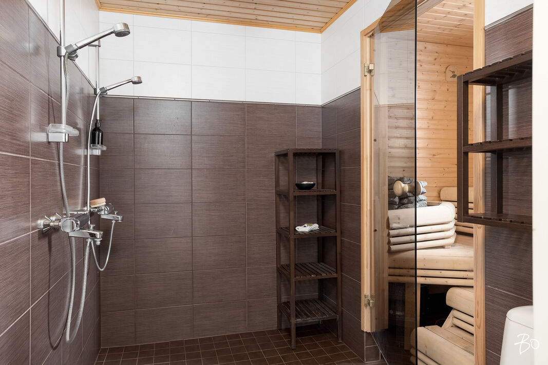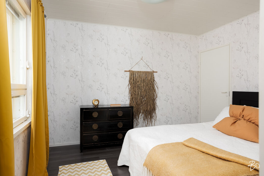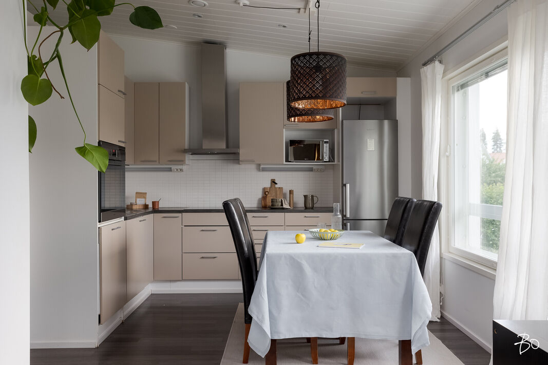 Tässä v. 2012 valmistuneessa kodissa on kolme makuuhuonetta, jossa yhdessä makuuhuoneessa on vaatehuone. Yksi makuuhuone on käytännöllisesti erillään kahdesta muusta makuuhuoneesta. Avara keittiö-olohuonetila, jossa on tunnelmaa luova takka. Olohuoneesta on kulku aurinkoiselle terassille ja piha-alueelle Piha-alueella on tasaista nurmettua aluetta, johon mahtuu näppärästi esimerkiksi trampolini. Valmiita istutuksia löytyy myös pihasta. Kylpyhuone, sauna ja kodinhoitotila ovat kivasti erillään muista tiloista ja kodinhoitohuoneesta on kulku toiselle asunnon terasseista.