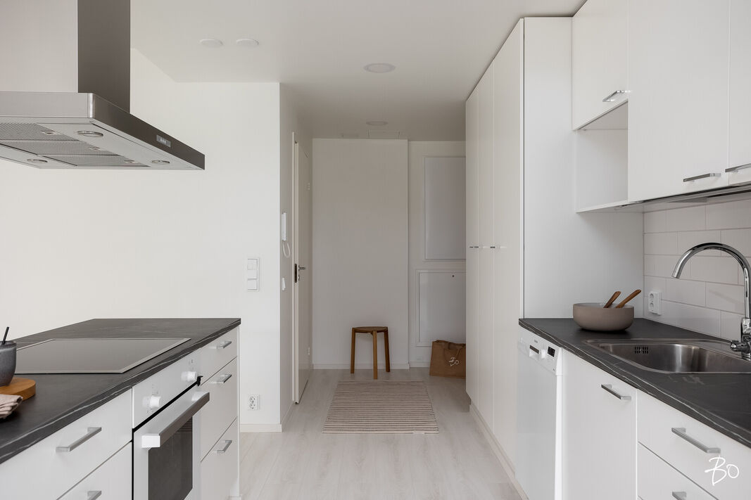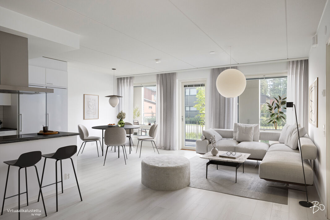 Tämä kolmen huoneen, keittiön ja saunan kokonaisuus tarjoaa kauniin ja valoisan asumiskokemuksen. Huoneistossa dominoivat vaaleat sävyt, jotka tuovat tilaan avaruutta ja raikkautta. Päätyhuoneiston sijainti takaa lisää rauhaa, yksityisyyttä ja valoa kotiisi.
