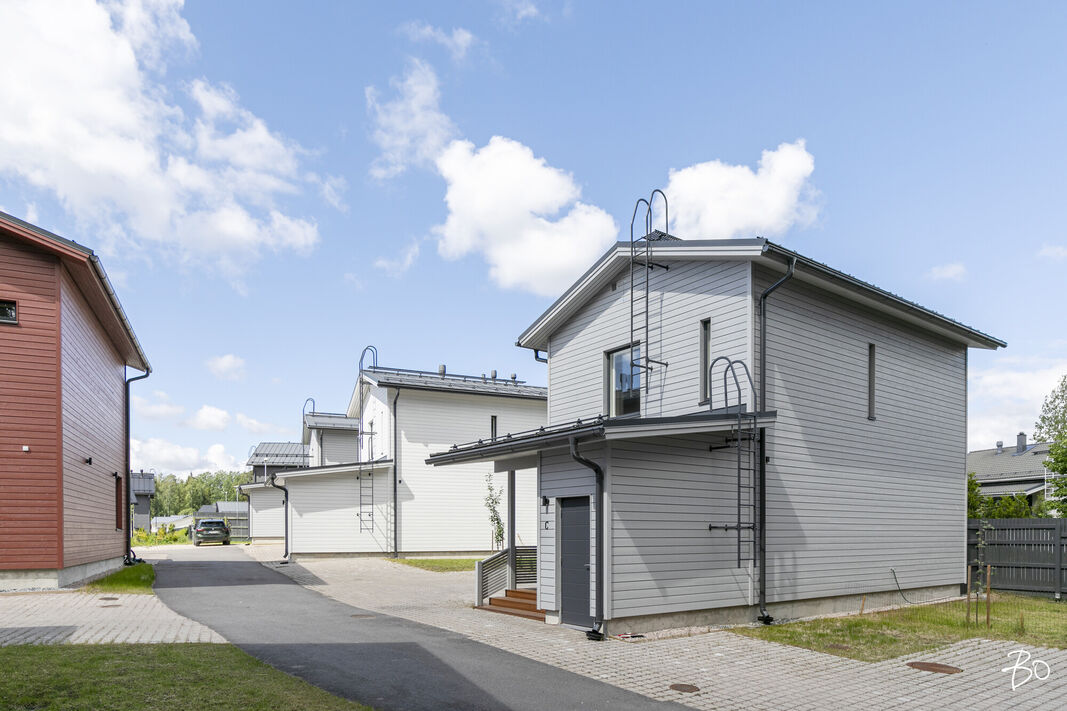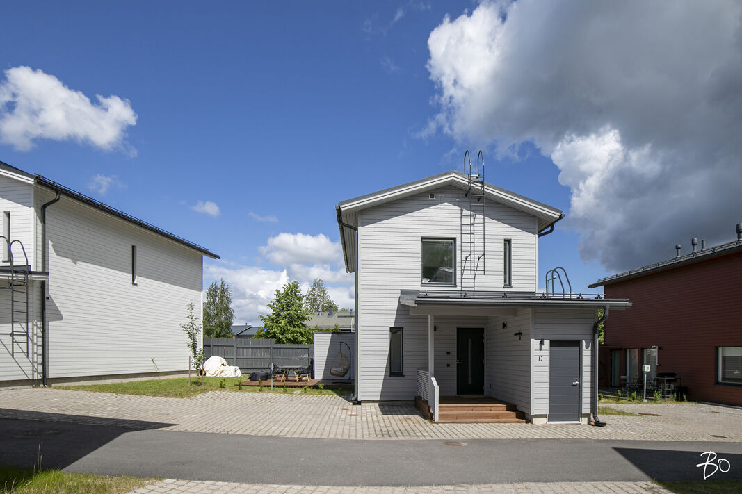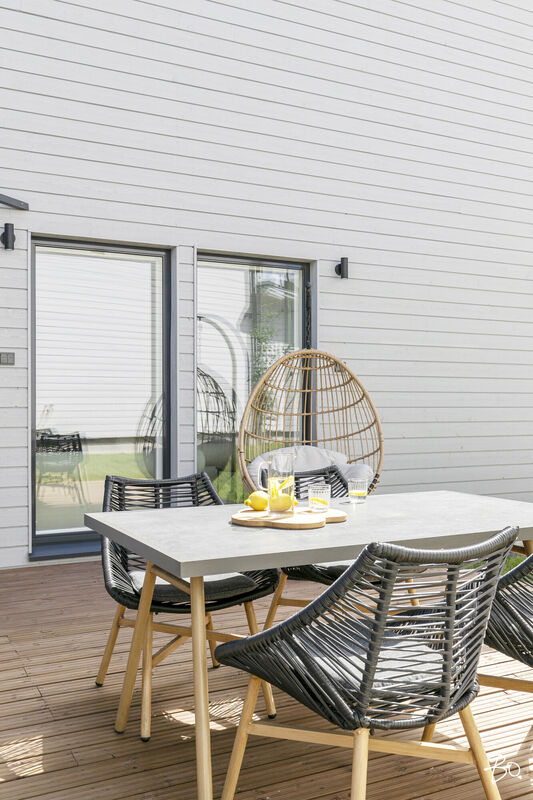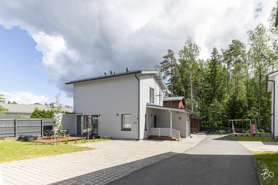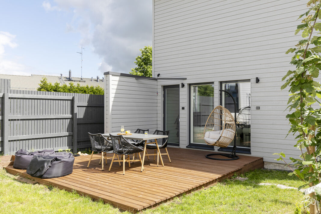Kohteen moderni muotoilu ulottuu myös ulkoalueille. Suuri terassi kutsuu nauttimaan aamukahvit auringonnousua ihastellen tai viettämään iltaa hyvässä seurassa. Puutarha on helppohoitoinen ja tarjoaa mahdollisuuksia niin viherpeukaloille kuin lasten leikeillekin. Tontilla on yhteiskäyttöön tarkoitettu leikkipaikka, joten perheen pienimmätkin on huomioitu.