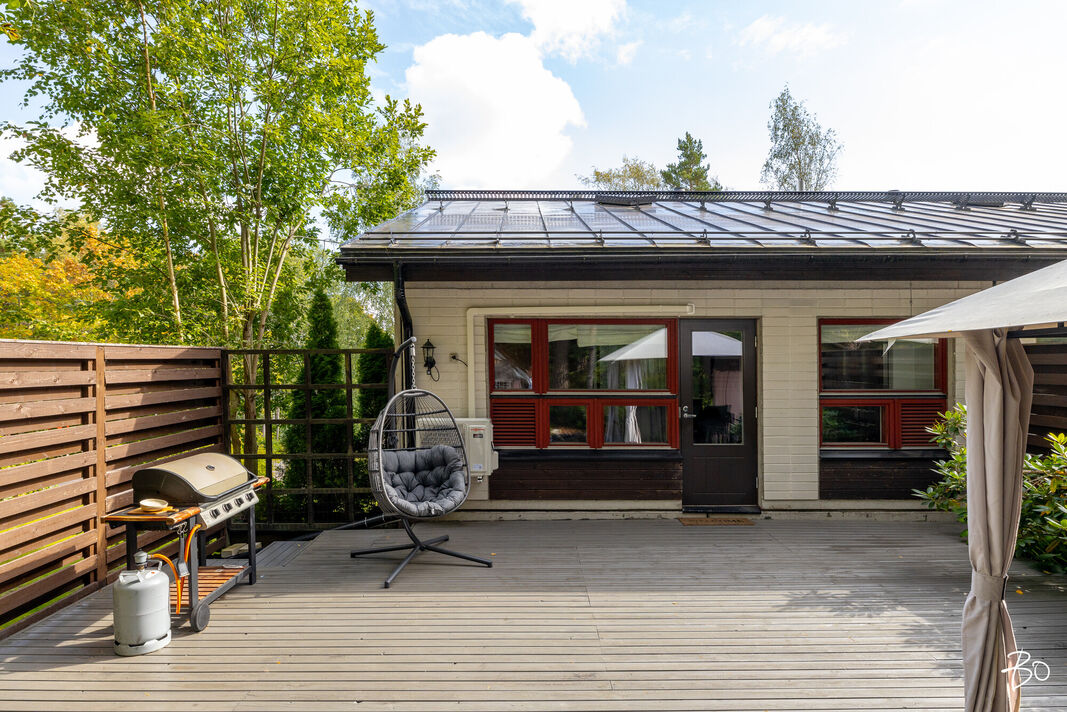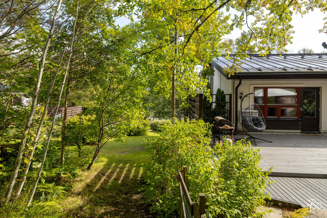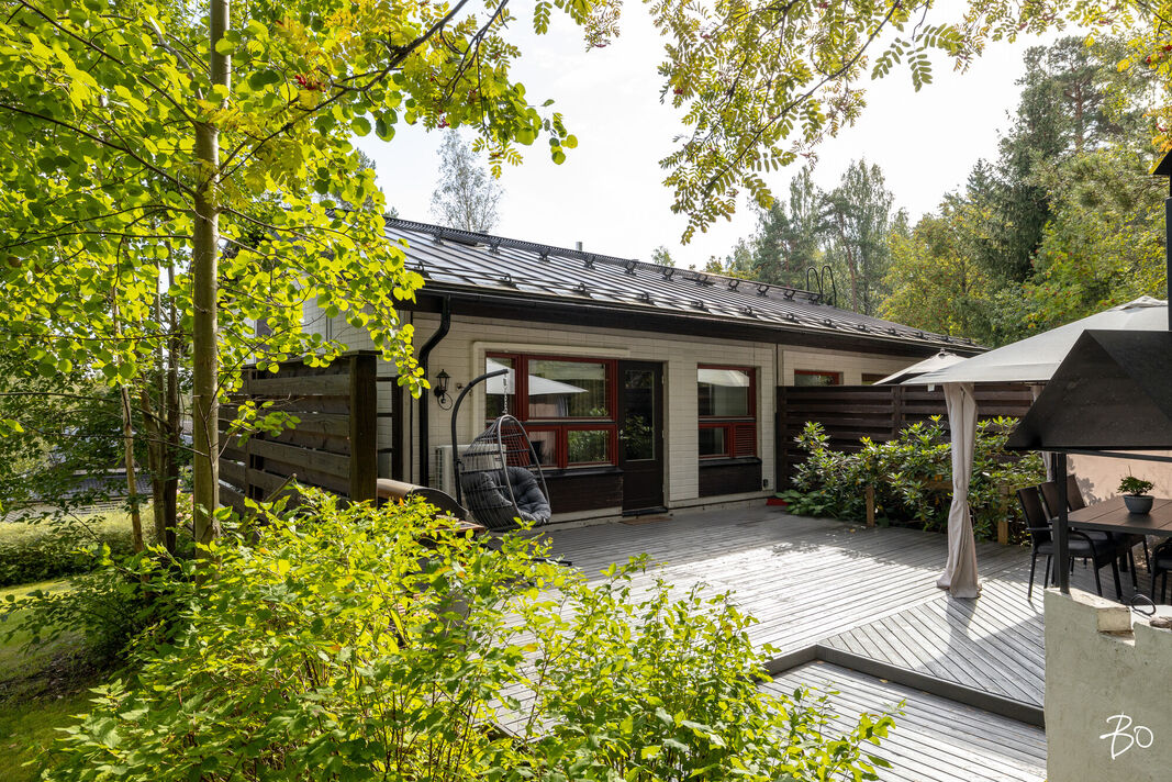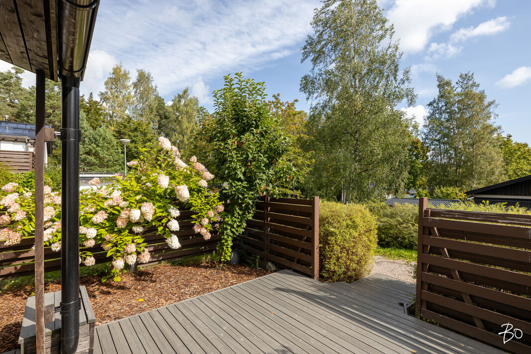 Paritalon pihalta avautuu metsänäkymä, mikä tarjoaa asukkailleen oivan mahdollisuuden nauttia vehreästä ympäristöstä ja rentoutumisesta omalla takapihalla. Piha-alue on erittäin viihtyisä ja pihan perältä löytyy lisäksi kodikas leikkimökki perheen pienemmille asukkaille.