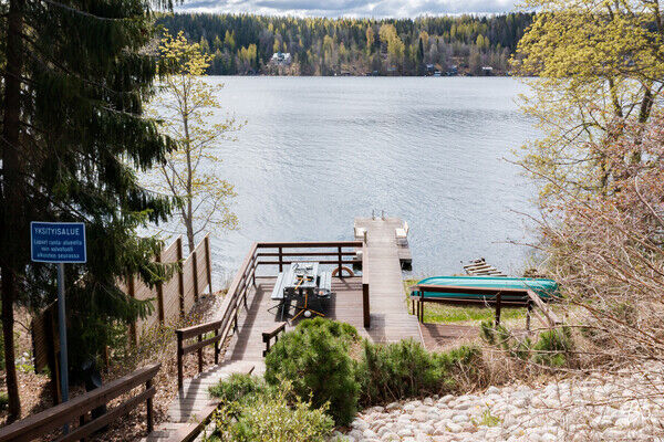 Muutaman sadan metrin päässä Kaukajärven rannassa on taloyhtiöiden oma yhteinen uimaranta laitureineen.