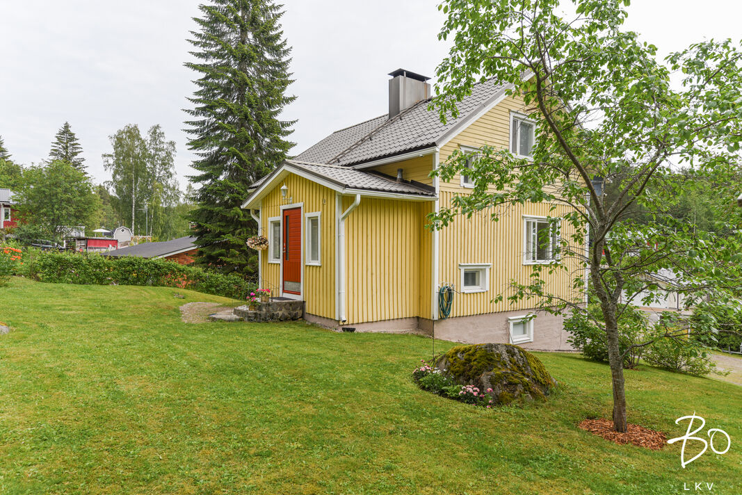 Tämä ylväänä rinteessä seisova puinen omakotitalo on todella kodikas ja lämmin. Tunnelman aistii jo tullessa hoidetulle pihamaalle, saatikka kun astuu eteisen nostalgiselle lautalattialle.