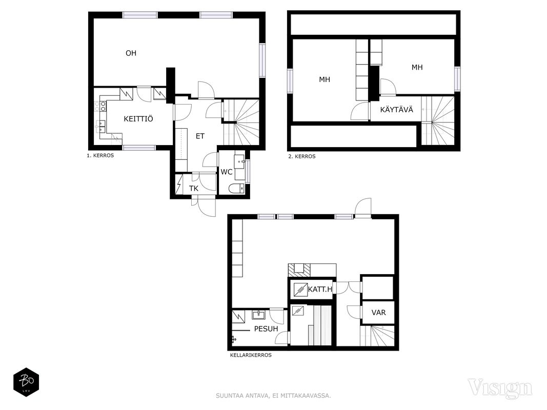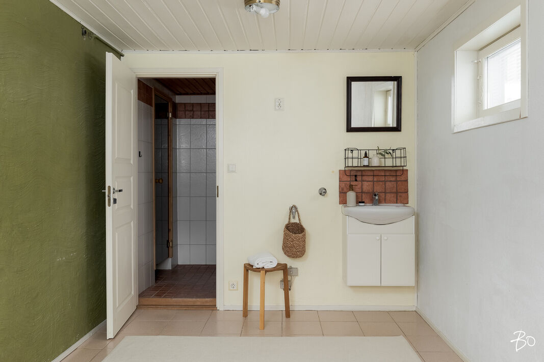 Kellarikerroksesta löytyy pesuhuone ja sauna sekä tilat pyykkihuoltoon sekä varastointiin. Kellari on raikkaan vaalea maalattuine pintoineen.