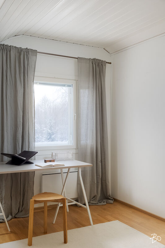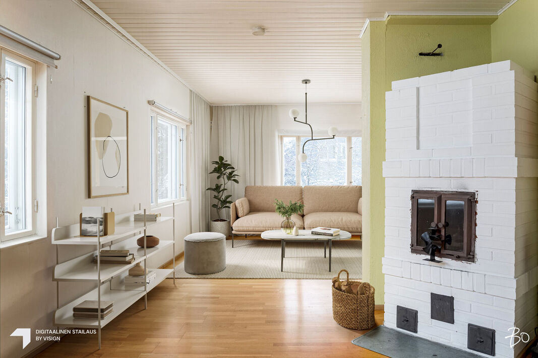 Keskikerroksessa on takka tuomassa tunnelmaa mutta toki myös lämmönlähteenä. Hiljattain on asennettu myös ilmalämpöpumppu lämmittämään ja kesällä viilentämään. Asumiskulut ovatkin kohtuulliset. Sisääntulokerros on kodin kiintopiste, tyypillisellä rintamamiestalon pohjaratkaisulla. Isohkot ikkunat päästävät valon kauniisti sisälle ja näkymä on kauas Olympiakylän raitille.