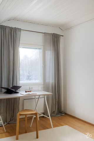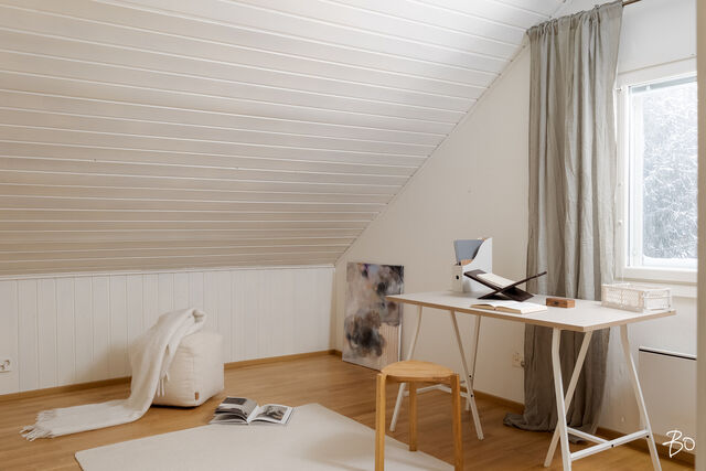 Yläkerrassa on kaksi sympaattista makuukammaria vinokattoineen. Suurempi makuuhuone on tilava - mahdollisesti jaettavissakin kahdeksi huoneeksi.