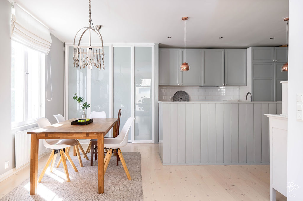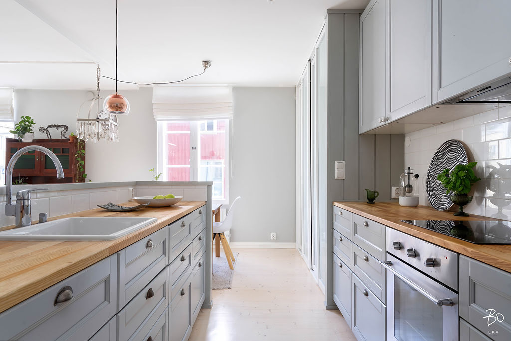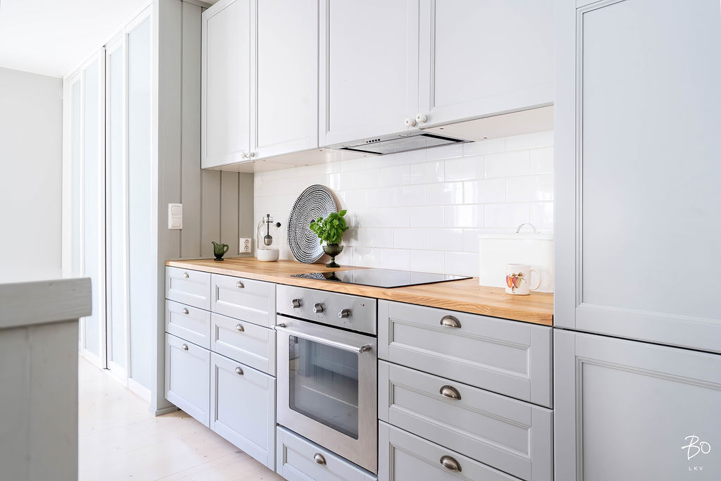 Varustus: jääkaappi/pakastin astianpesukone, induktioliesi, kalusteuuni, liesituuletin, paljon säilytys- ja laskutilaa.