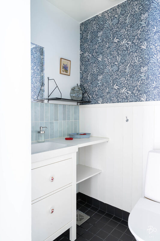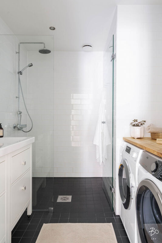 suihku, suihkuseinä, allas/allaskaappi, peili, pesukoneliitäntä, tilaa pesukoneelle ja kuivurille, kaappi, laatoitettu, lattialämmitys.