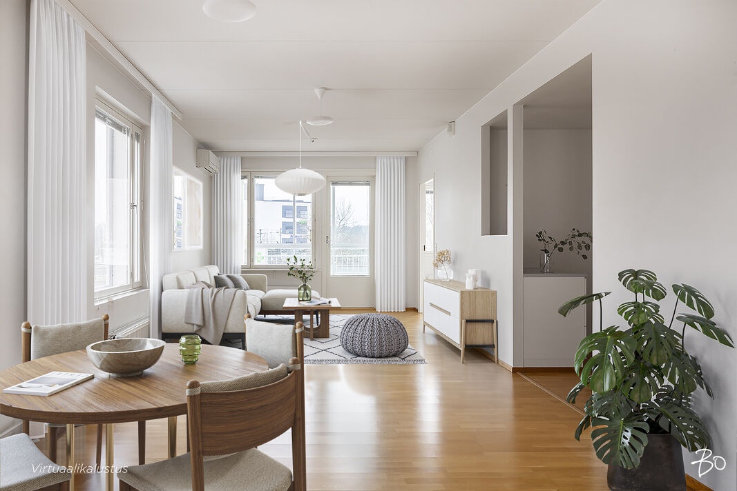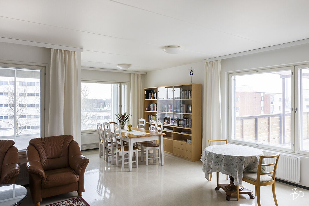 Harvoin tarjolla oleva hyväkuntoinen, muuttovalmis ylimmän asuinkerroksen perheasunto. Tässä kulmahuoneistossa on ikkunat kolmeen ilmansuuntaan, joten luonnonvaloa on runsaasti tarjolla. Asunnossa on muun muassa kolme makuuhuonetta, joista suurimman yhteydessä vaatehuone, tilava olohuone, sauna. Lasitettu parveke on tietysti myös. Keittiössä on runsas varustelu, löytyy iso jääkaappi ja pakastin sekä hyvin laskutilaa. Asumismukavuutta lisää kaksi wc:tä.