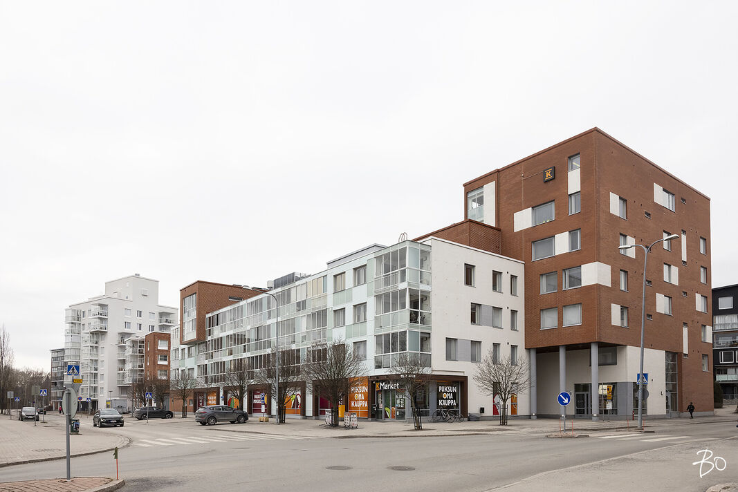 Sijainti on mitä mainioin. Samassa talossa on K-Market, kivenheiton päässä löytyy iso S-Market sekä Pukinmäen juna-asema. Bussipysäkki on myös on talon välittömässä läheisyydessä.