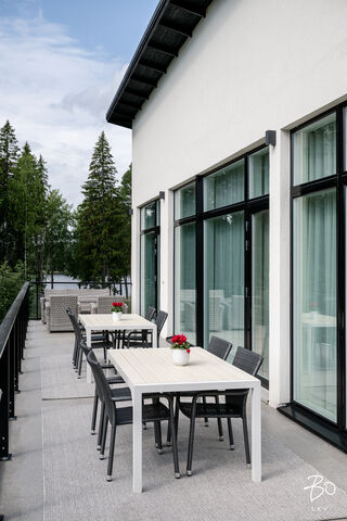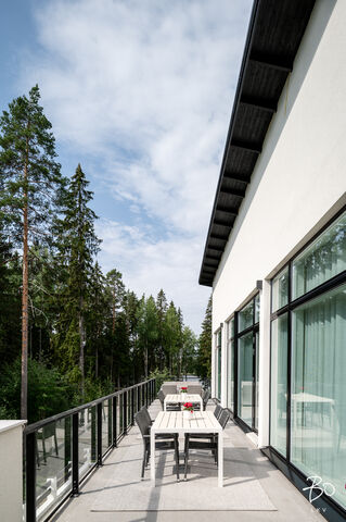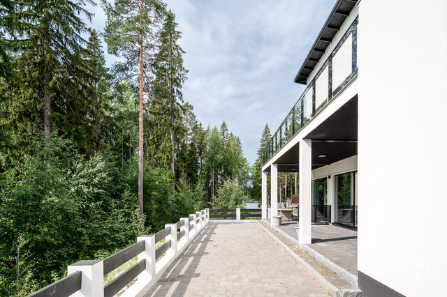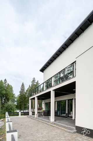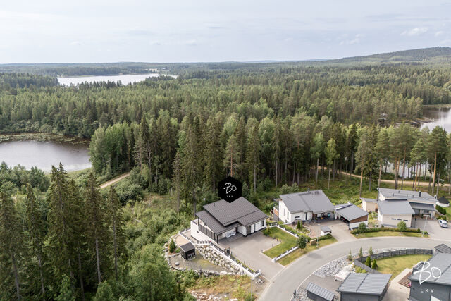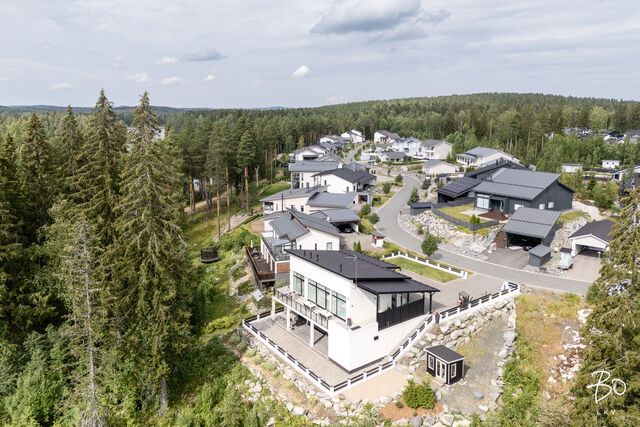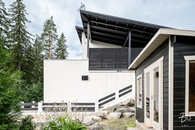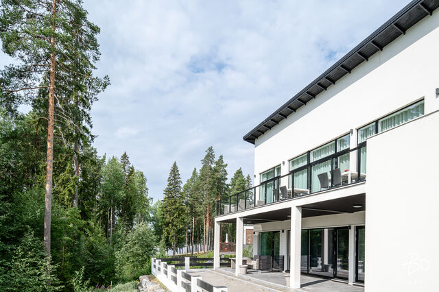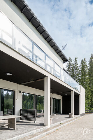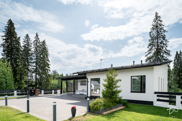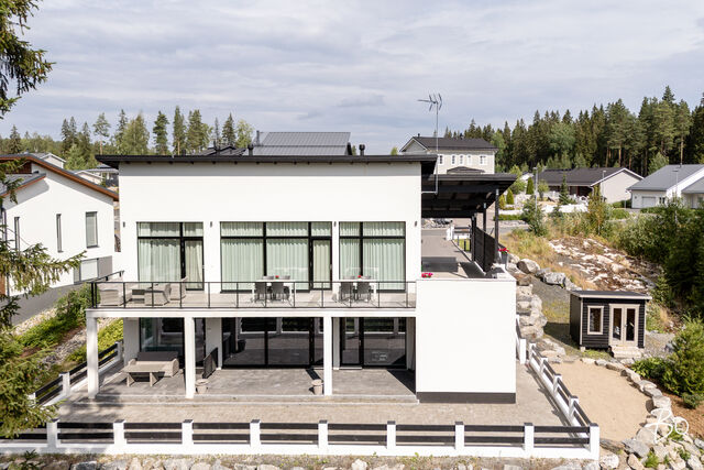 Tämä maalämmöllä varustettu kivitalo on suunniteltu pieteetillä pienintäkin yksityiskohtaa myöten niin, että arki kodissa on hyvää, vaivatonta ja täynnä niin isoja kuin pieniä ylellisyyksiä. Kaikissa huoneissa on valtavan suuret ikkunat, joista luonnonvalo pääse esteettömästi kulkemaan tilasta toiseen. Olohuone, keittiö sekä ruokailutila ovat samaa suurta kokonaisuutta, johon huikea huonekorkeus, suuret valkeat lattialaatat ja puhtaanvalkoiset seinät luovat käsittämättömän hienon avaruuden tunnun.