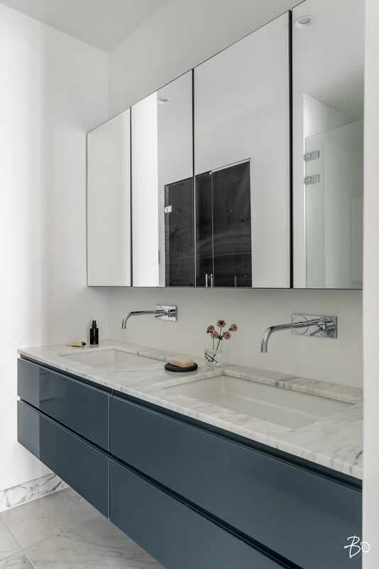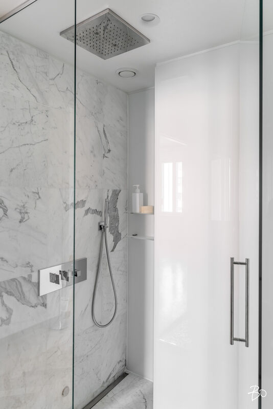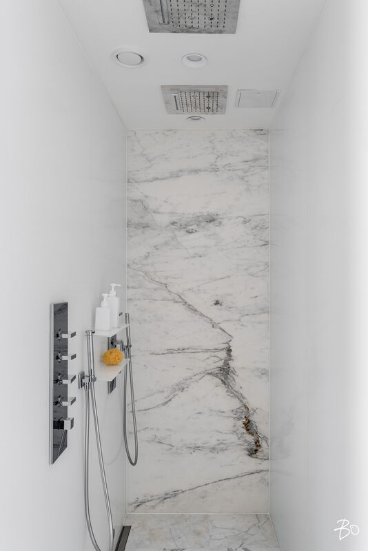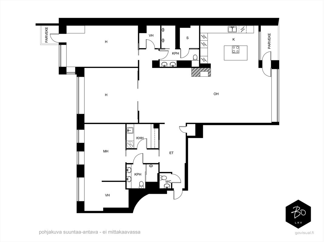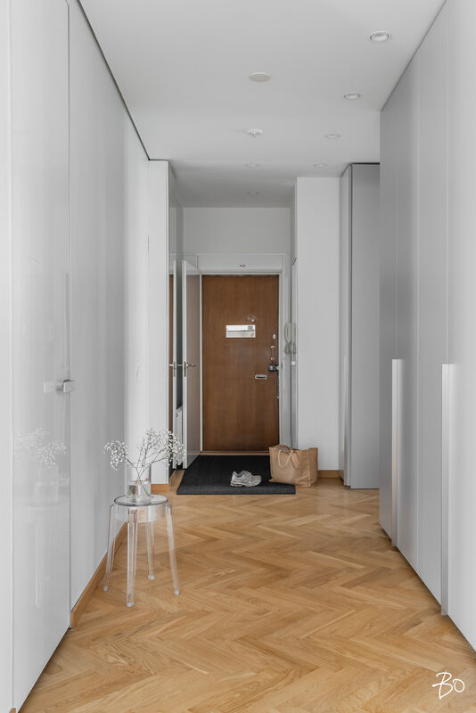 Asunnon sydän on kaunis Binovan keittiö, jossa on suuri saareke, joka yhdistyy tilavaan olohuoneeseen ja ruokailutilaan. Asunnossa on kaksi makuuhuonetta, joista yhden yhteydessä on parveke sisäpihalle. Lisäksi olohuoneen yhteydessä huone, joka taipuu niin makuuhuoneeksi kuin työhuoneeksi. Kylpyhuoneita on kaksi, ja lisäksi löytyy höyrysauna, kodinhoitohuone sekä kaksi vaatehuonetta.