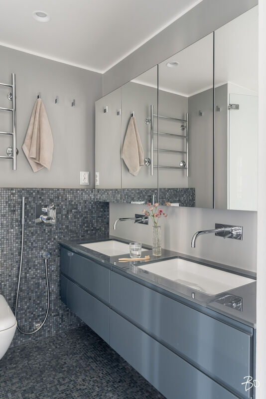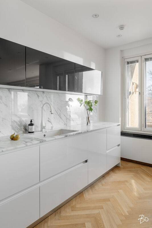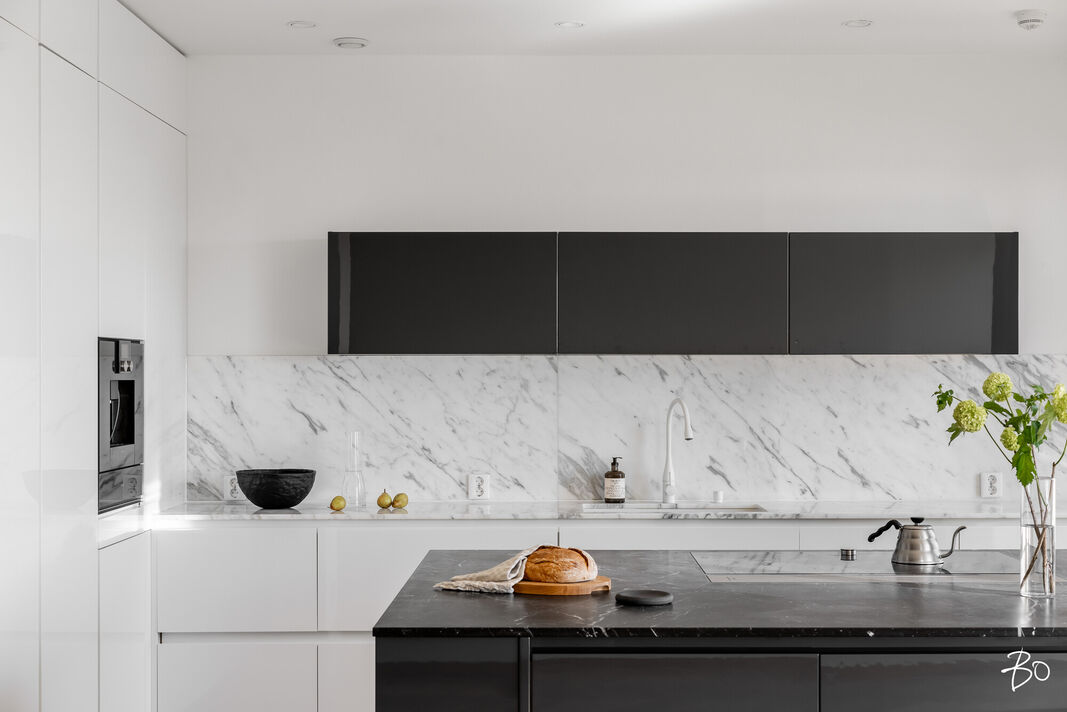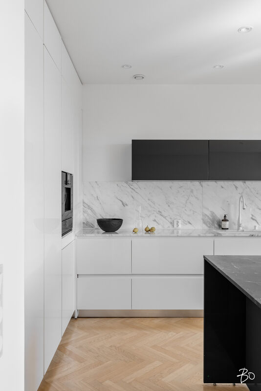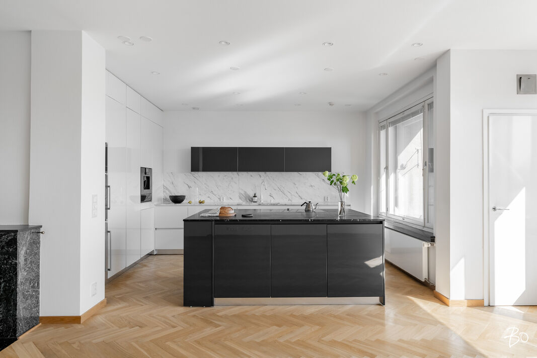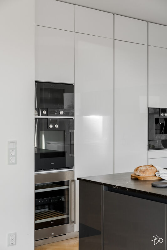 Varustus: integroidut täyskorkeat jääkaappi (Siemens uusittu 2025) ja pakastin, astianpesukone, kahvikone, viinikaappi, kalusteuuni, kalusteisiin asennettu mikro, saarekkeessa induktiokeittotaso liesituulettimella, kivitasot.