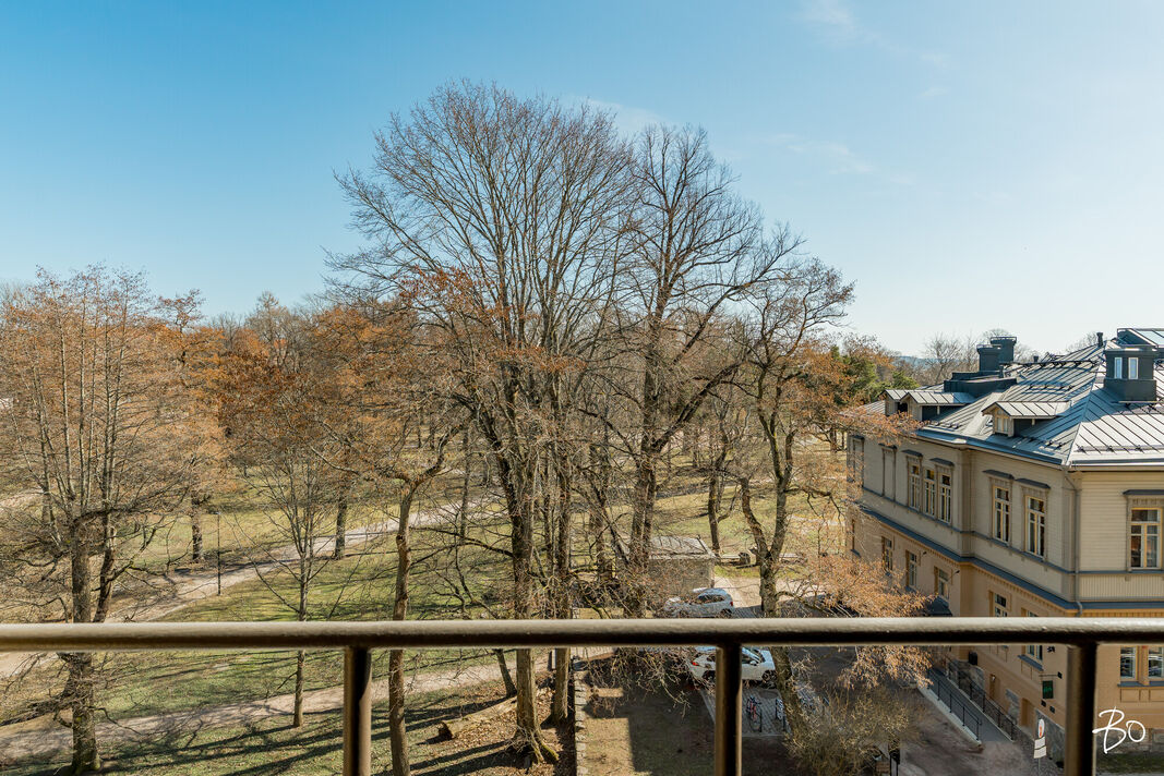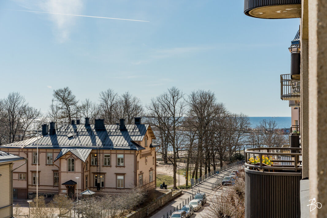 Tätä kokonaisuutta täydentää parveke, josta kauniit näkymät Kaivopuiston yli aina merelle saakka.