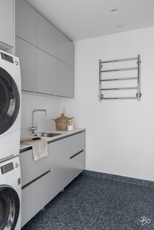 Varustus: pesukoneliitäntä, pesukone, kuivausrumpu, pyyhekuivain, taso-/työskentelytilaa, lattiakaivo, lattialämmitys.