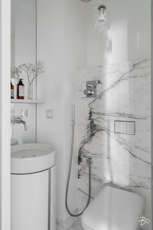 Varustus: wc-istuin, bidee-suihku, allas/allaskaappi, peili, marmorihylly.