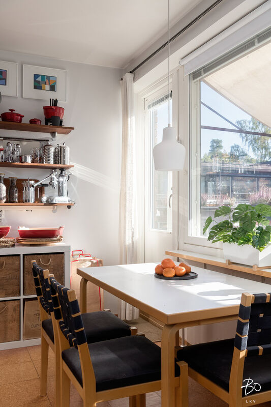 Tämä ihana koti sijaitsee pienkerrostalon toisessa, ylimmässä kerroksessa.