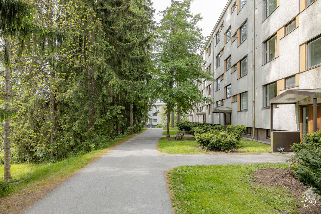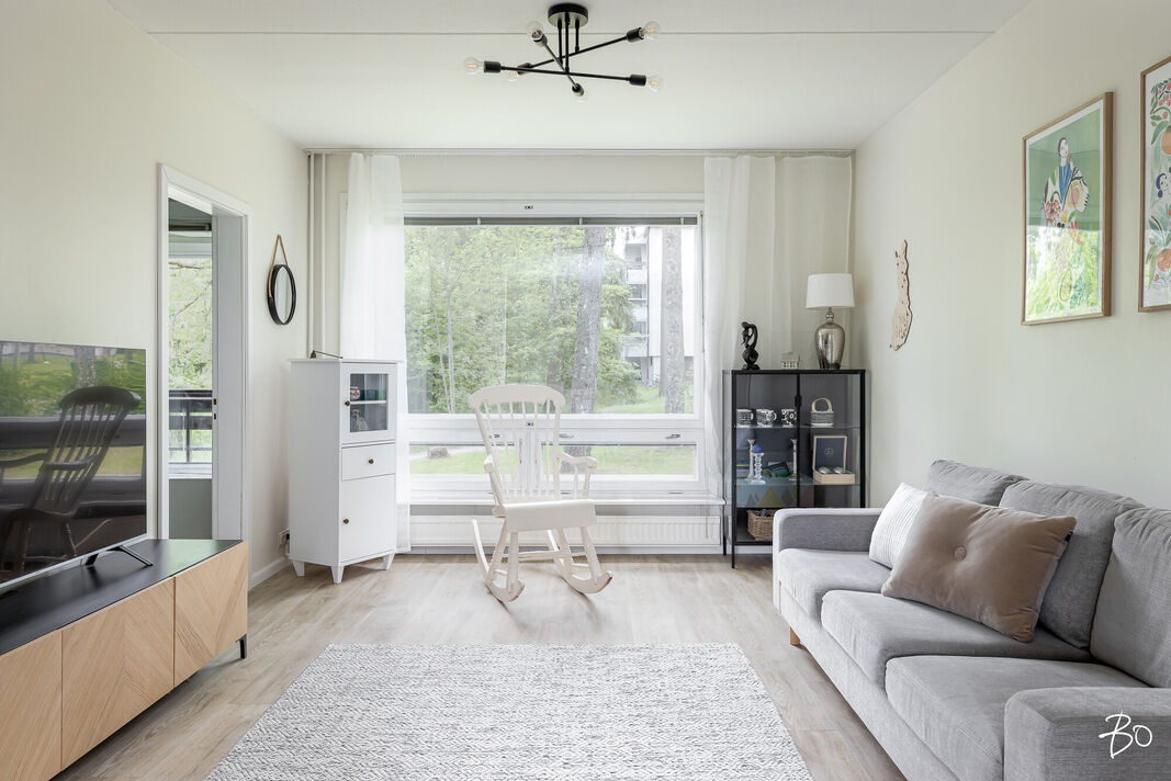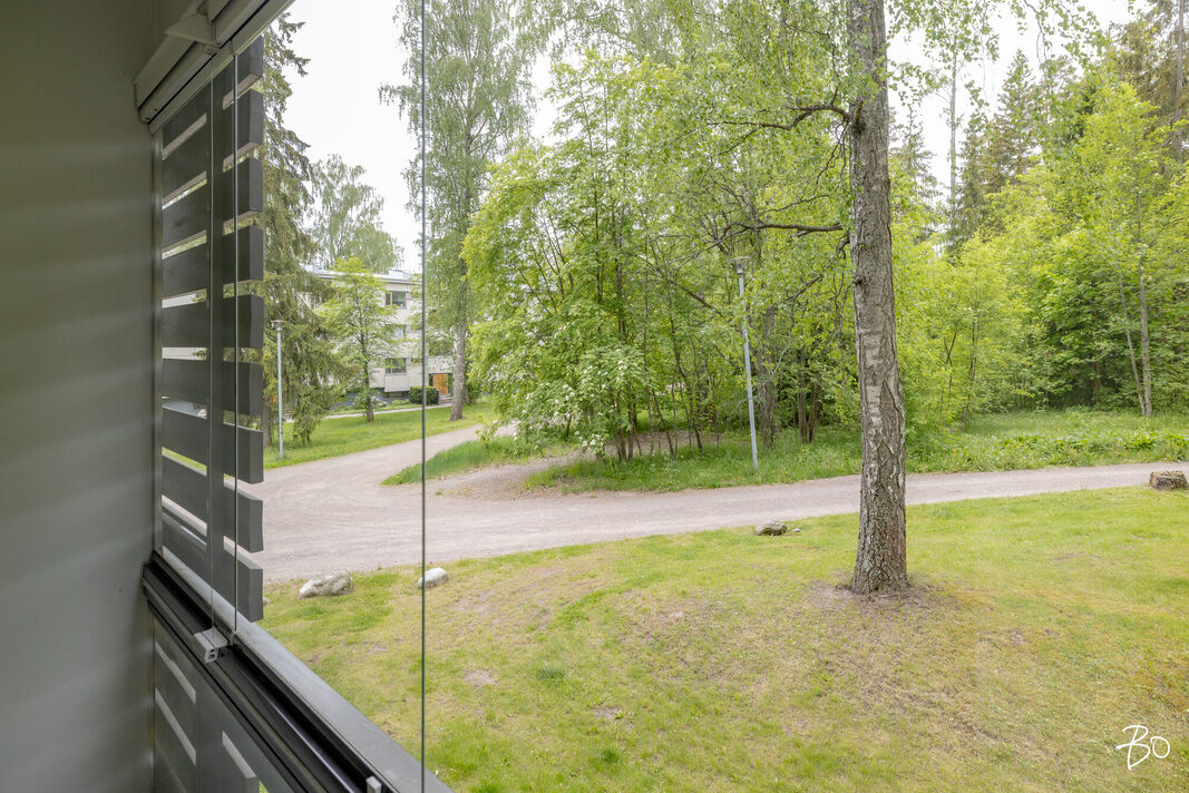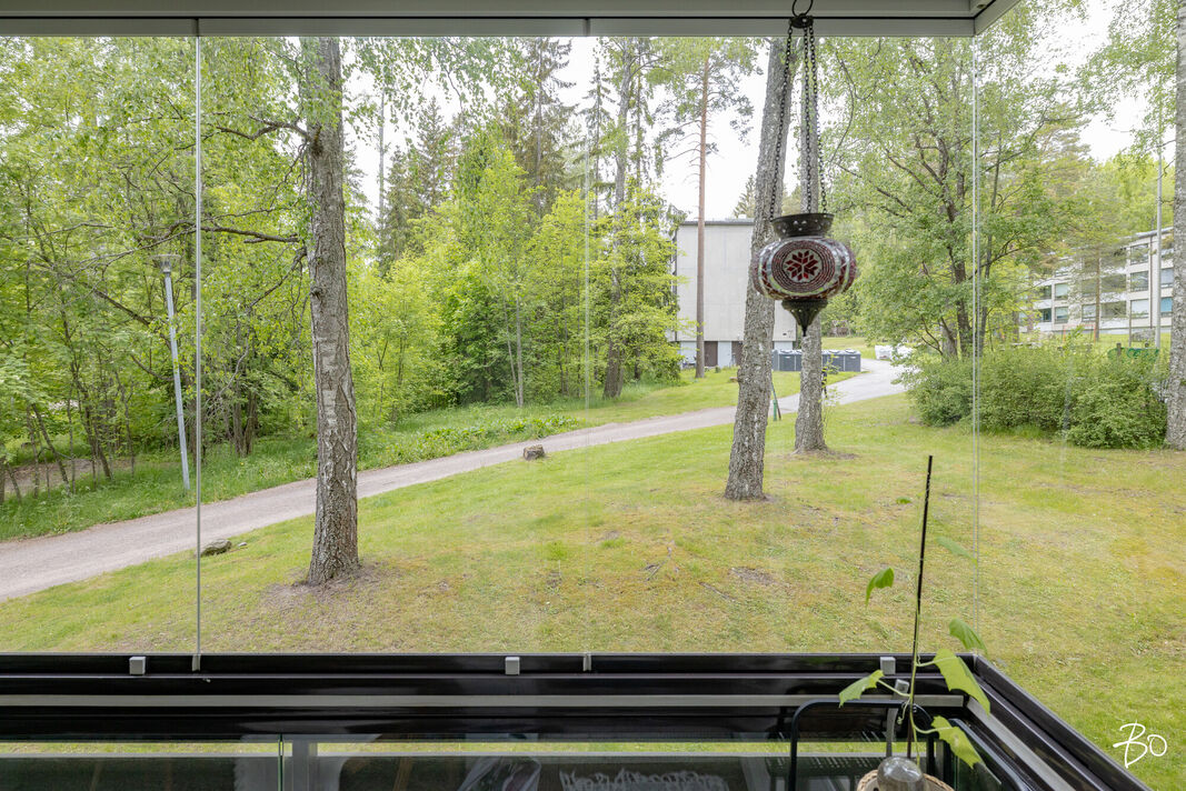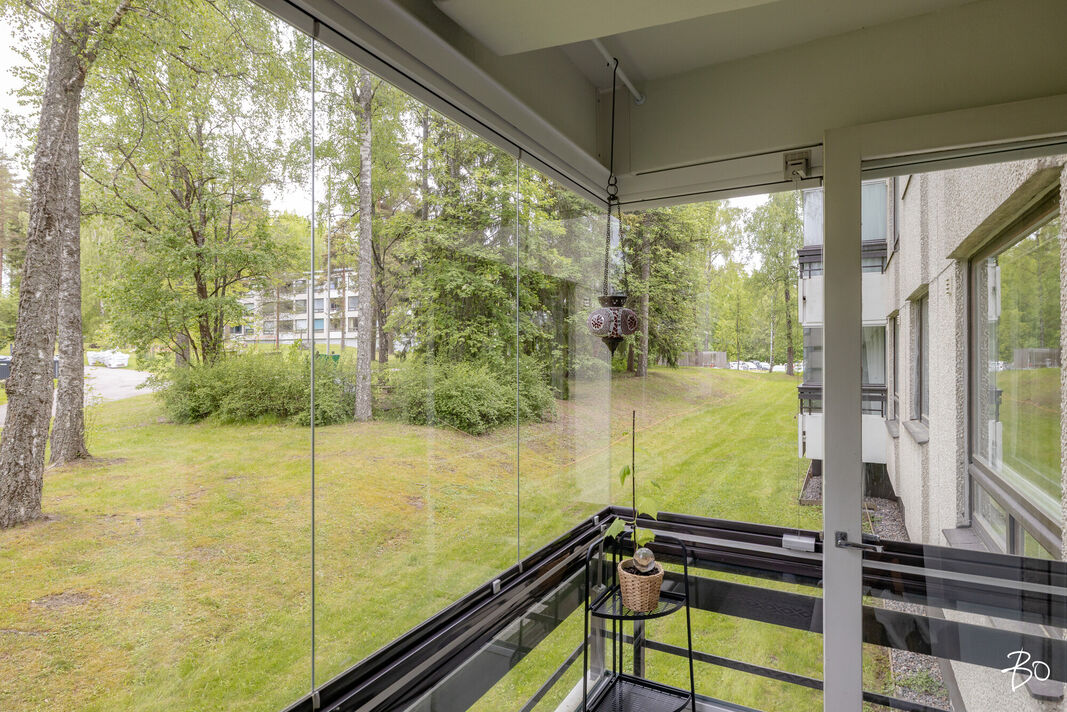 Asunnossa on kaksi tilavaa makuuhuonetta, keittiö, kylpyhuone ja lasitettu parveke, jolta avautuvat vehreät näkymät. Vuonna 2021 remontoitu keittiö tarjoaa nykyaikaiset puitteet herkutteluun ja samana vuonna vaihdettu vinyylilattia luo esteettisesti miellyttävän ja helppohoitoisen pinnan. Tämän ensimmäisen kerroksen asunnon sijoittelu ei kuitenkaan ole suoraan maantasossa, mikä lisää turvallisuutta ja mukavuutta.