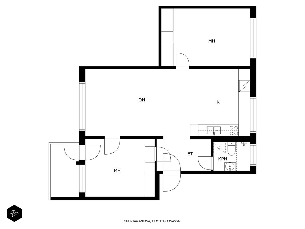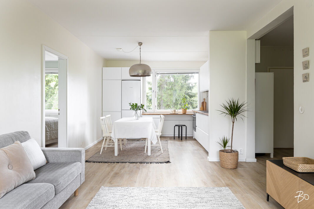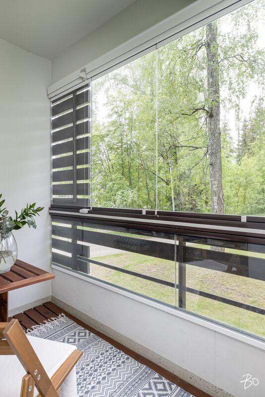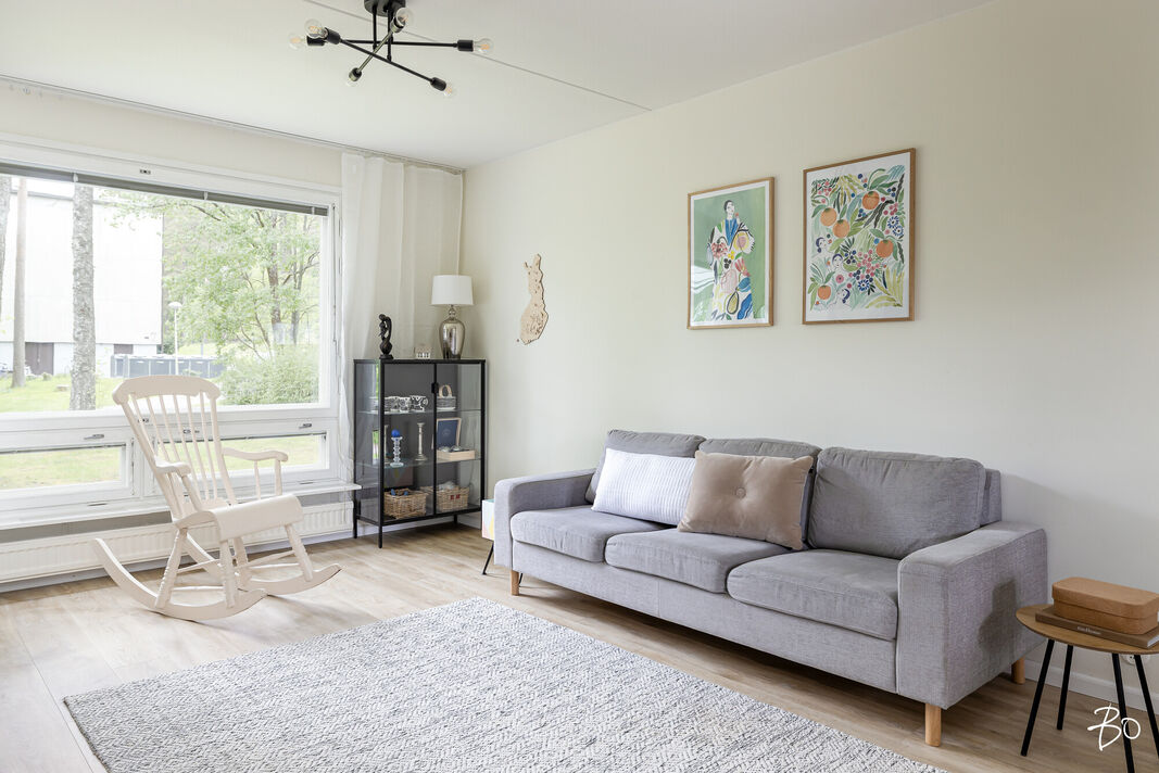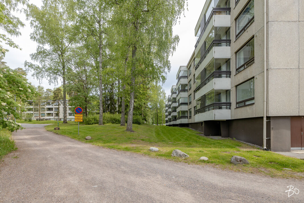 Asunnossa on kaksi tilavaa makuuhuonetta, keittiö, kylpyhuone ja lasitettu parveke, jolta avautuvat vehreät näkymät. Vuonna 2021 remontoitu keittiö tarjoaa nykyaikaiset puitteet herkutteluun ja samana vuonna vaihdettu vinyylilattia luo esteettisesti miellyttävän ja helppohoitoisen pinnan. Tämän ensimmäisen kerroksen asunnon sijoittelu ei kuitenkaan ole suoraan maantasossa, mikä lisää turvallisuutta ja mukavuutta.
