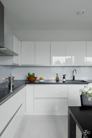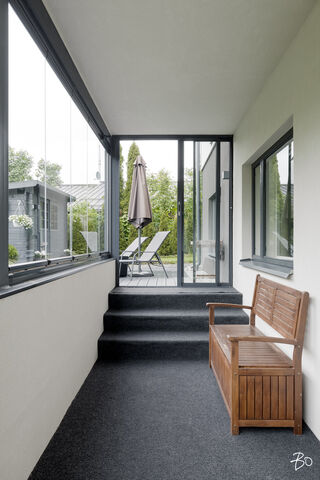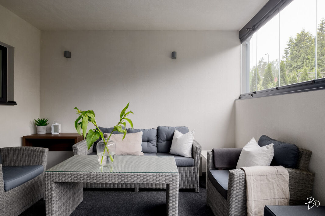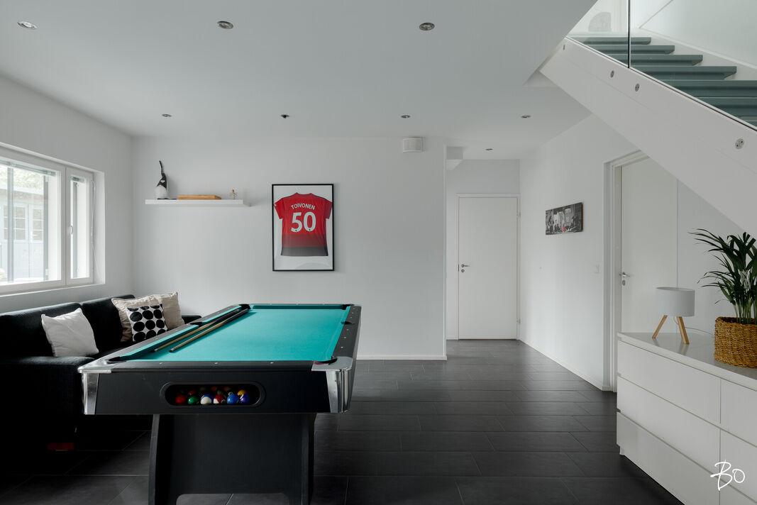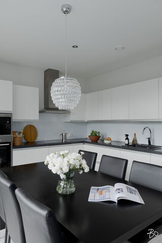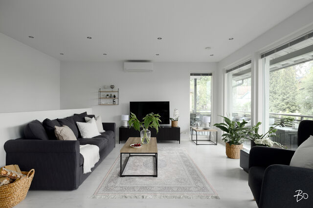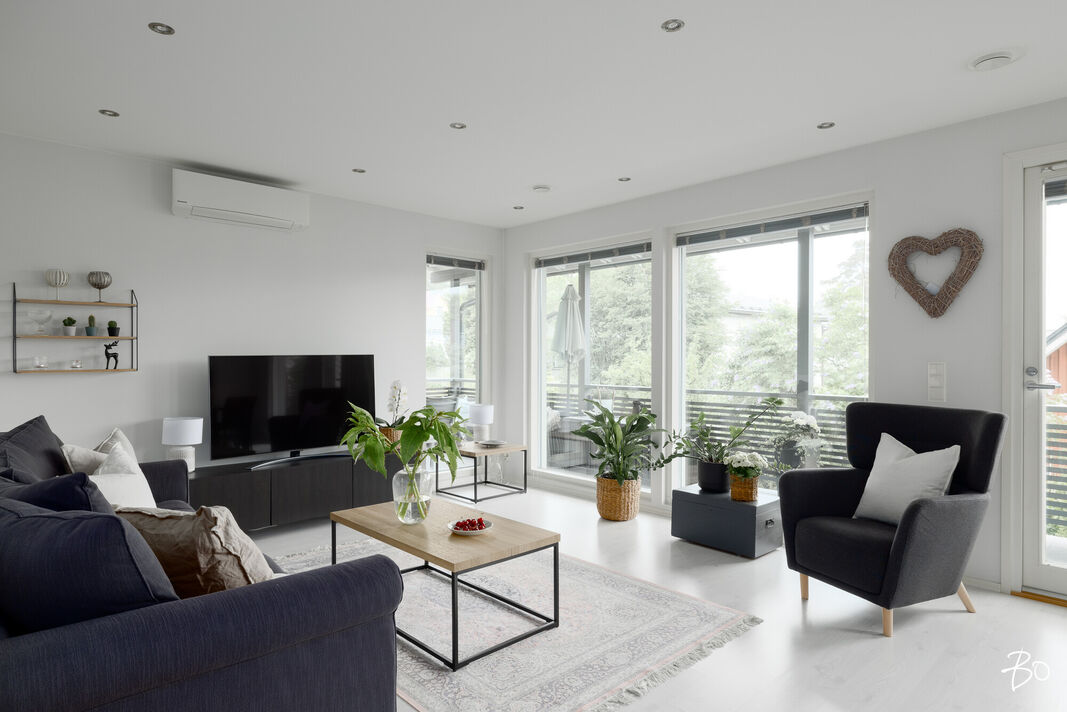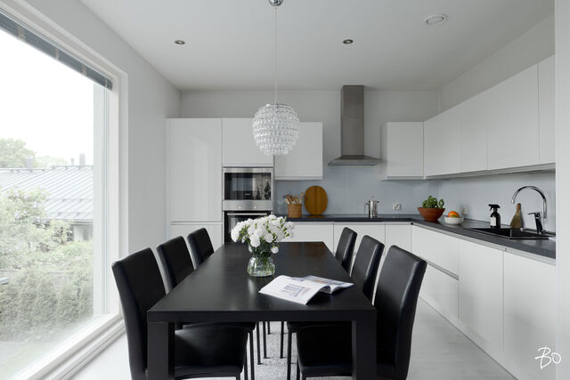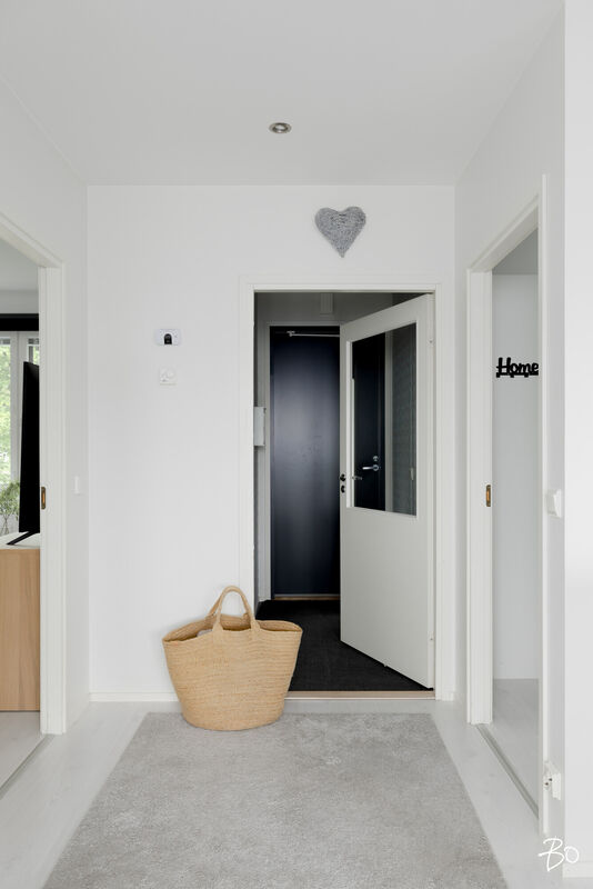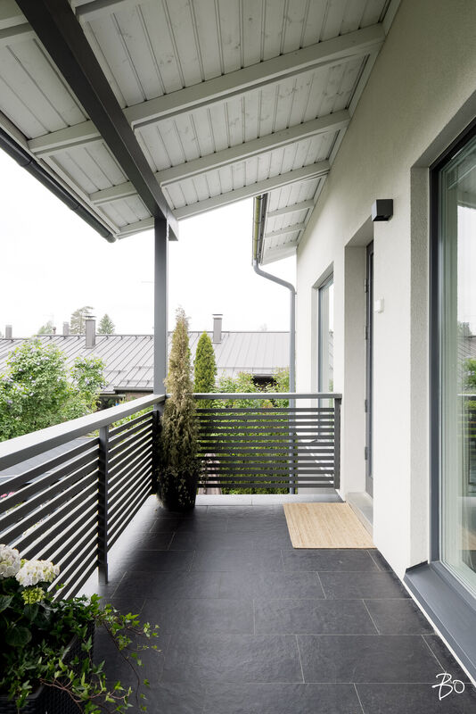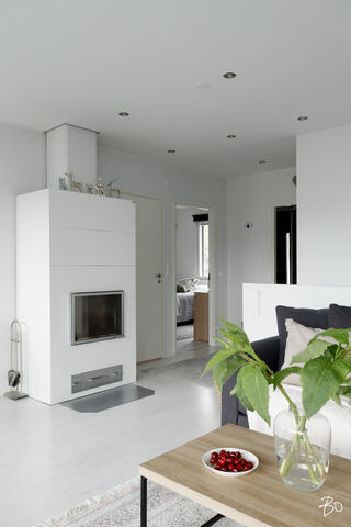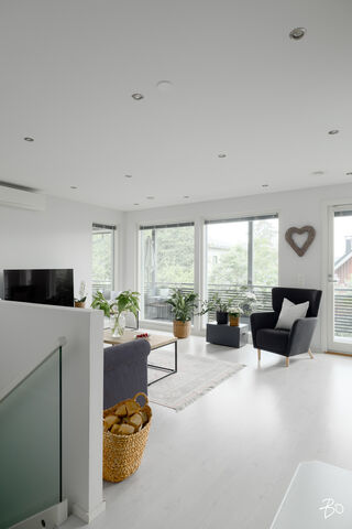 Tähän taloon tulvii valoa sen suurista ikkunoista, ja tämä korostuu erityisesti talon sydämenä toimivassa avarassa keittiön ja olohuoneen yhdistelmässä, jossa ikkunat ovat lähes koko seinän korkuiset. Puustellin laadukas keittiö on modernisti varusteltu ja toteutettu ajattoman tyylikkäillä valinnoilla. Keittiössä on tilaa suurellekin ruokapöydälle ja olohuoneen puolella oleskeluryhmälle, jossa koko perhe mahtuu viettämään aikaa yhdessä. Takka tuo tunnelmaa viileämpinä vuodenaikoina, kun taas kesäisin suuri parveke toimii olohuoneen jatkeena, ja siitä avautuu avarat näkymät lähistön kattojen ylle. Tässä sisääntulokerroksessa sijaitsee myös kaksi hyvän kokoista makuuhuonetta rauhallisen etupihan puolella.