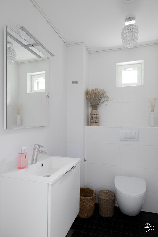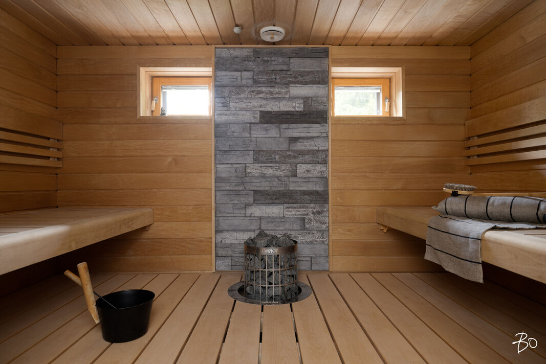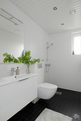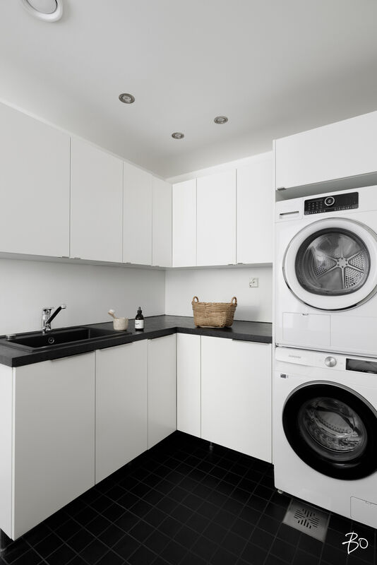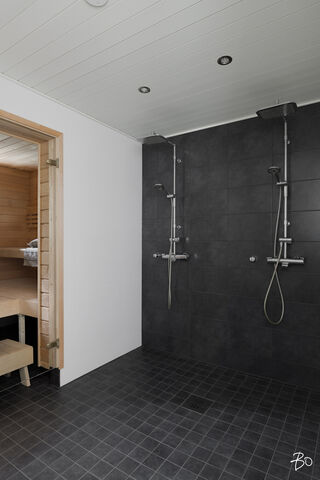 Alakerrassa sijaitsee lisäksi pesutila, jossa on tilavan saunan ja kahden suihkun lisäksi toimiva kodinhoitotila vaatehuoneineen, sekä erillinen wc. Lisäksi tässä kerroksessa on yksi virallinen makuuhuone ja yksi tilavana makuuhuoneena toimiva varastohuone, ja tilava aula, johon saa halutessaan toteutettua yhden makuuhuoneen lisää alkuperäisen piirustuksen mukaisesti. Aulatilasta on käynti tilavalle lasitetulle terassille, joka palvelee ylimääräisenä olohuoneena aikaisesta keväästä pitkälle syksyyn.