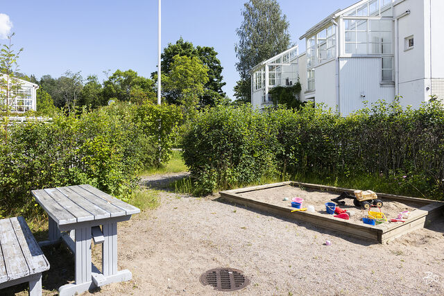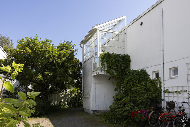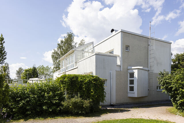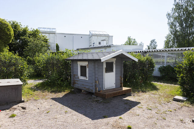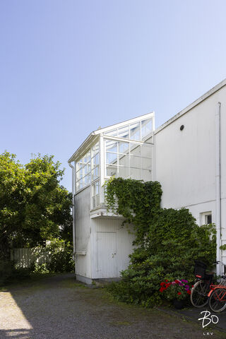 Alakerrassa avautuu valoisa olohuone, jossa lämpöä ja tunnelmaa luo varaava takka. Alakerrassa sijaitsevat myös monikäyttöinen makuuhuone, keittiö, erillinen WC sekä tekninen tila. Yläkerrassa on kaksi makuuhuonetta, joista toisesta on käynti lasitettuun viherhuoneeseen ja edelleen parvekkeelle. Yläkerrassa ovat myös sauna ja kylpyhuone, jonka yhteydessä on lasitettu parveke vilvoittelua varten. Lisäksi yläkerrassa on vaatehuone sekä erillinen WC. Tilava asunto tarjoaa erinomaisen mahdollisuuden kunnostaa kokonaisuus upeaksi oman näköiseksi kodiksi.
