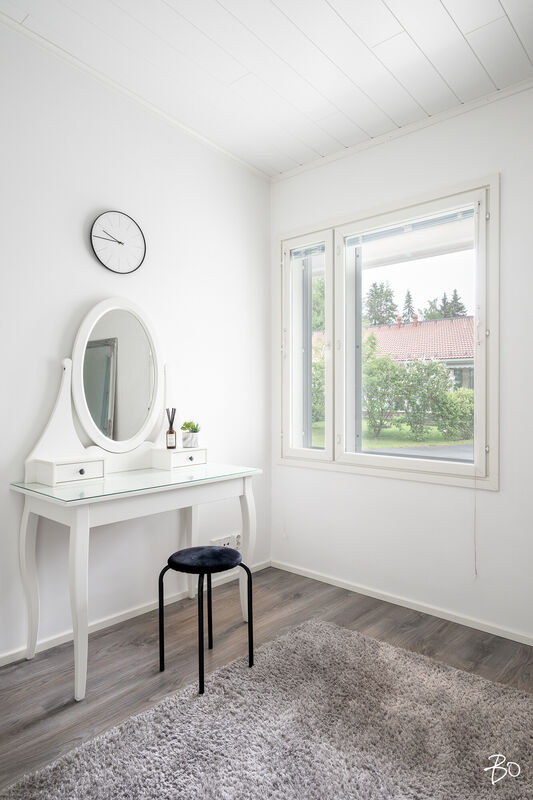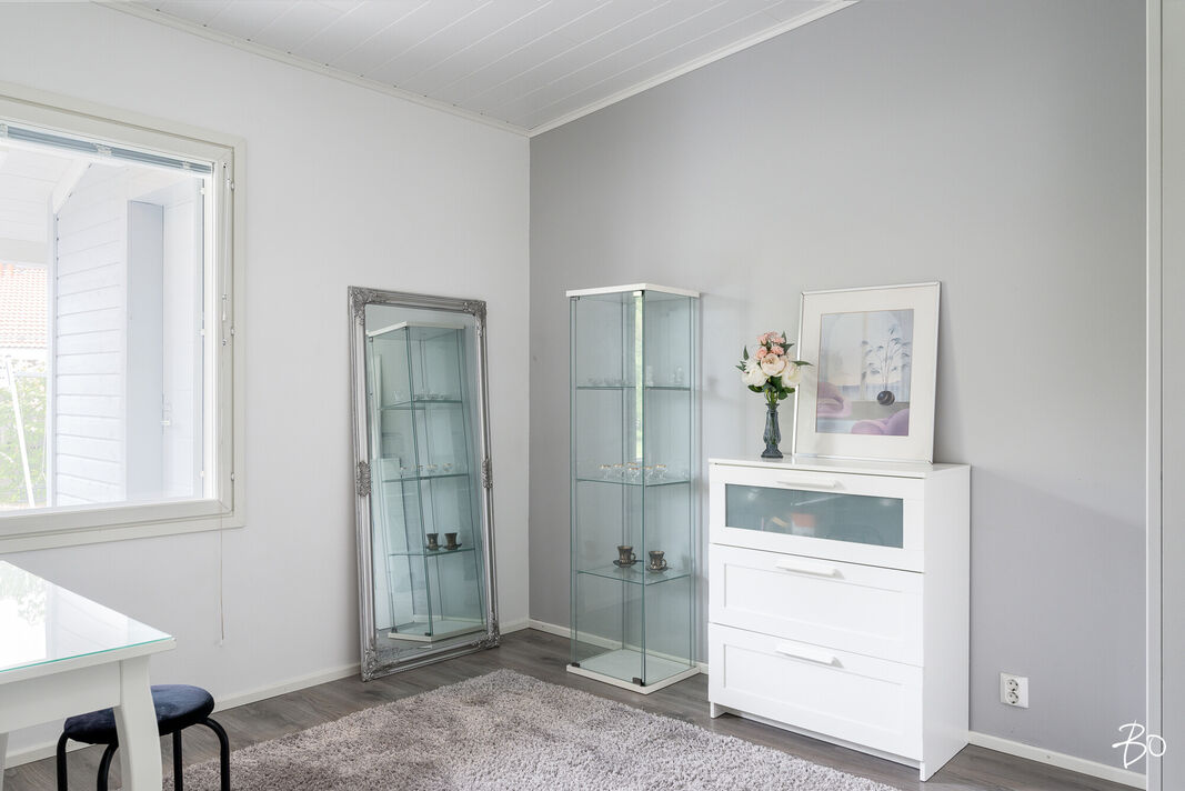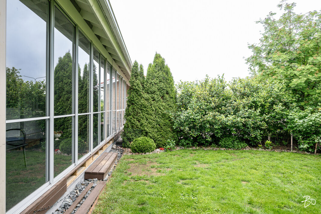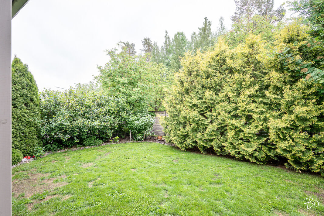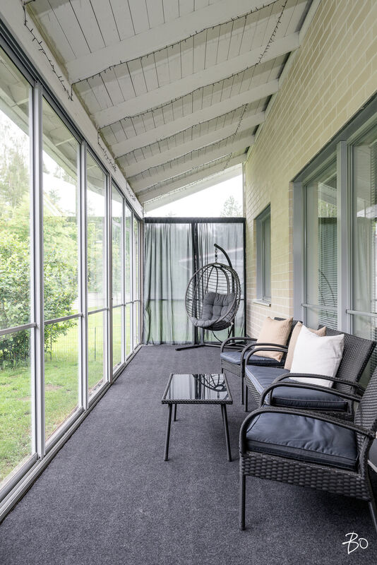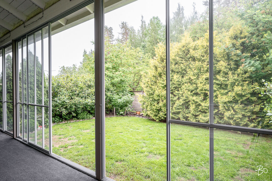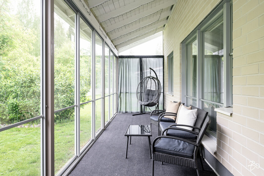 Kodin olohuoneesta on kulku suurelle lasitetulle terassille, jossa nautit niin aamukahveista kuin illan viimeisistä auringonsäteistä. Lasituksen ansiosta säilyvät terassikalusteetkin säältä suojassa. Kodilla on lisäksi mukavan kokoinen ja vehreä, aidattu takapiha.