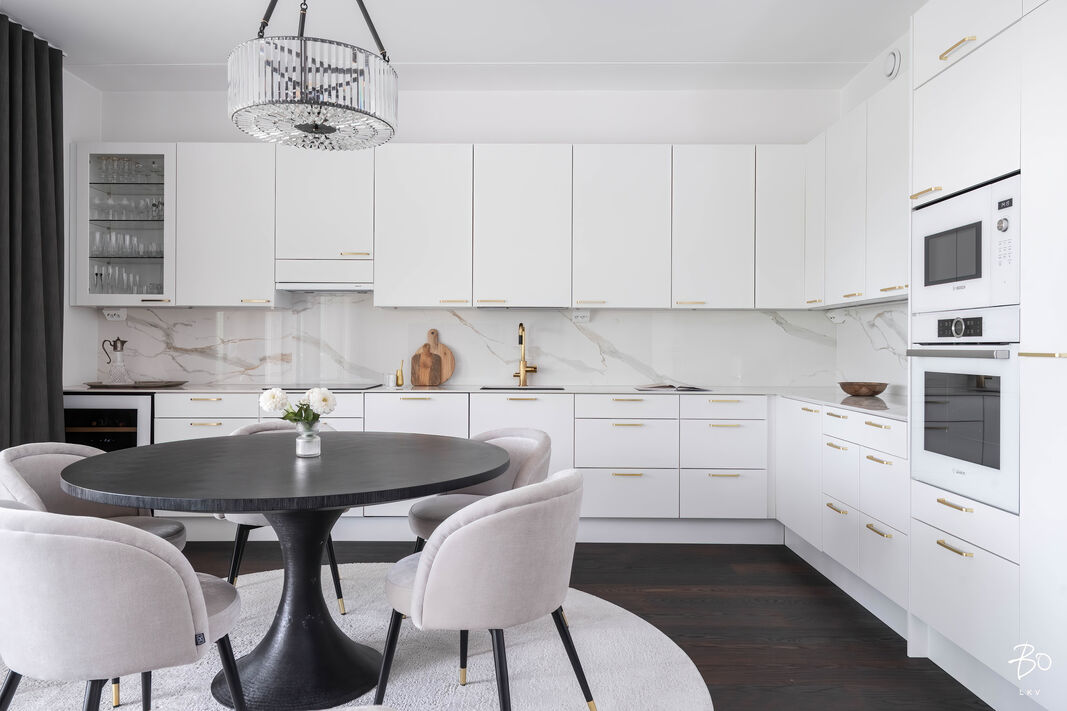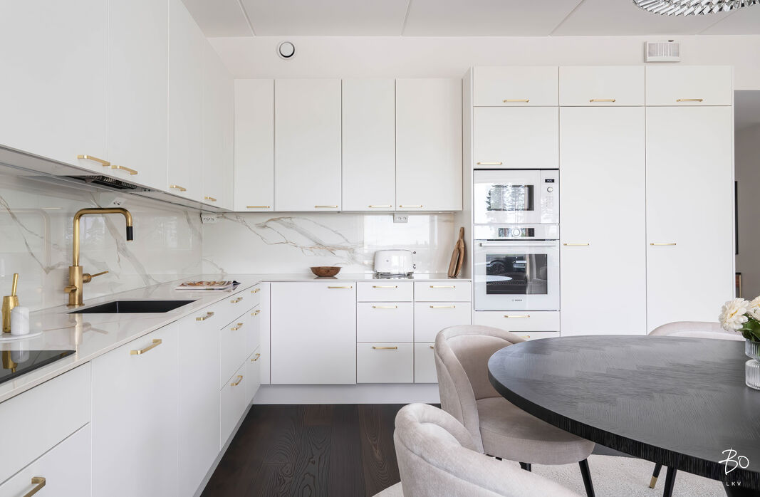 Olohuone-keittiö ratkaisu on todella avara ja valoisa. Toimivuuteen suunnitellussa keittiössä on todella paljon kaappitilaa ja luksuksen tuntua tuo mm. viinikaappi.