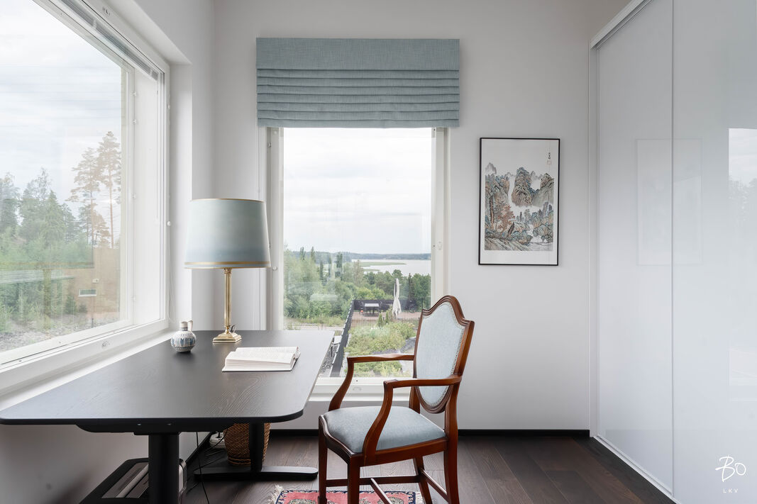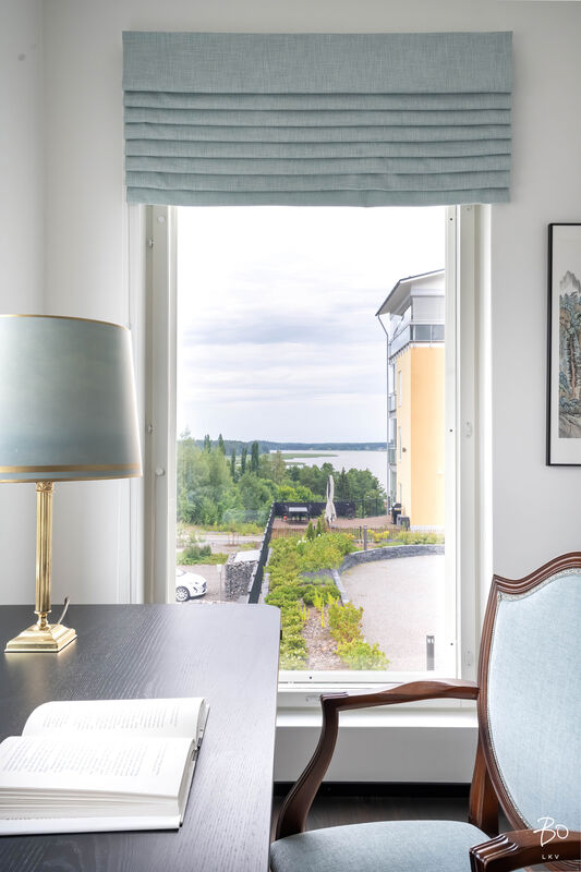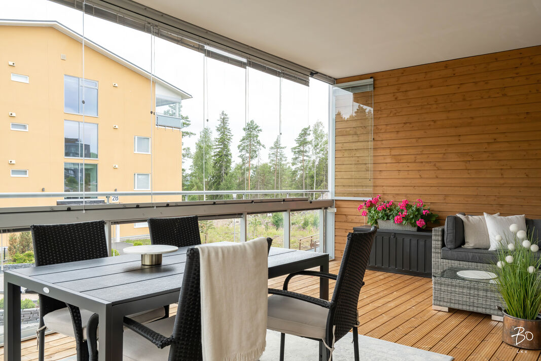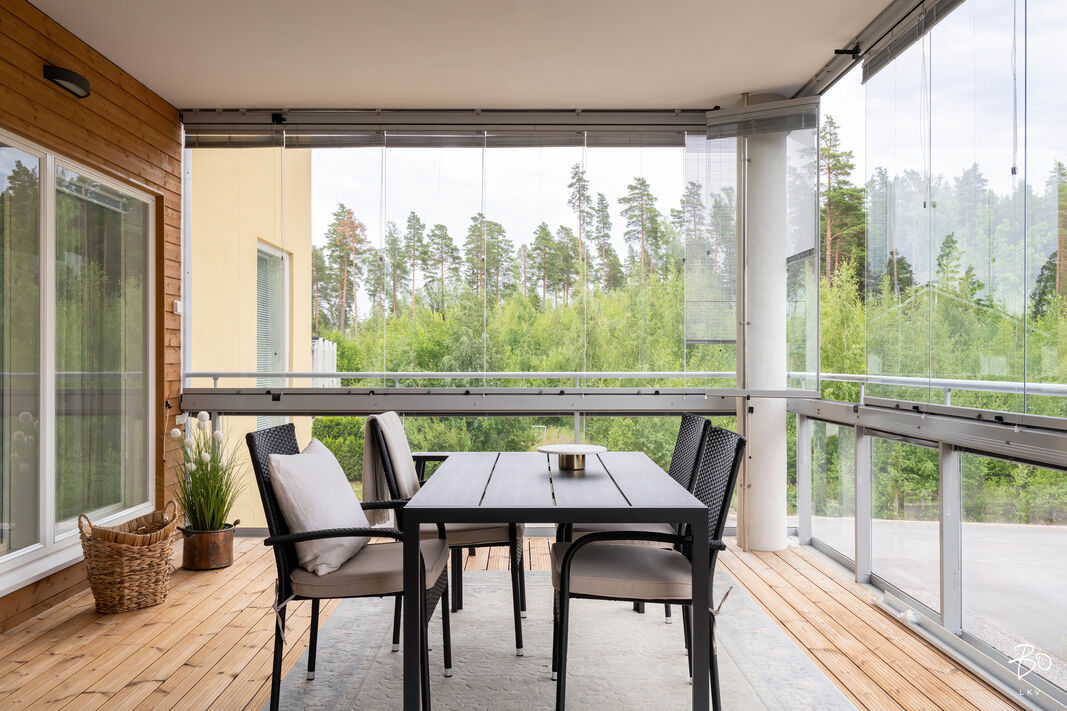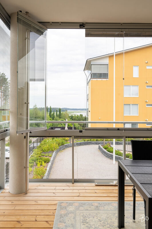 Iso lasitettu parveke merinäkymällä toimii lisähuoneena lähes vuoden ympäri. Kodin kolme makuuhuonetta löytyvät yhdeltä seinämältä ja käytävän toisella puolella sijaitsevat kaunis kylpyhuone saunoineen sekä erillinen wc.