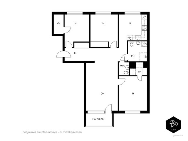 Kodissa on kolmen makuuhuoneen lisäksi keittiö, josta löytyy kaikki tarvittavat toiminnallisuudet ja oma paikkansa myös ruokailuryhmälle. Todella tilavan olohuoneen yhteydessä on lasitettu parveke vehreän sisäpihan suuntaan.