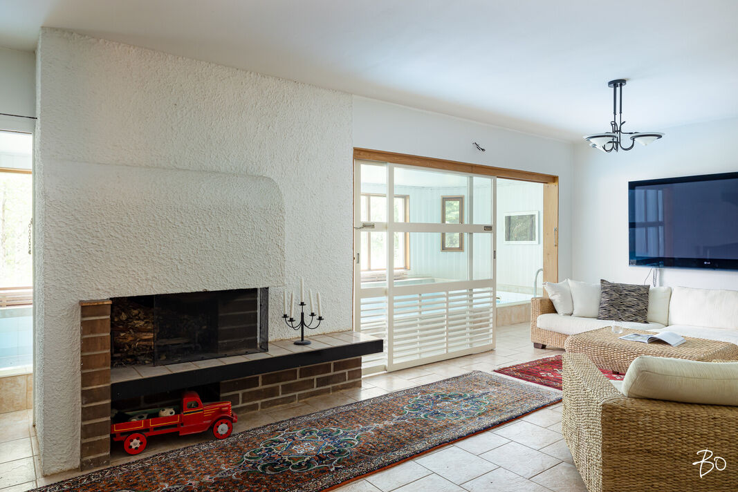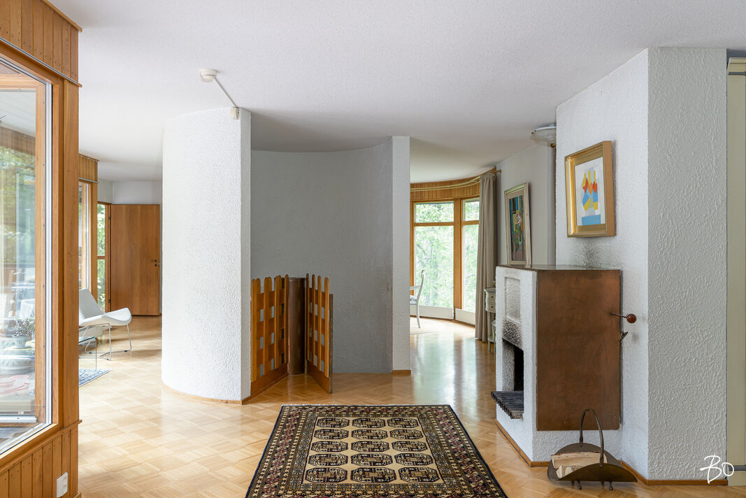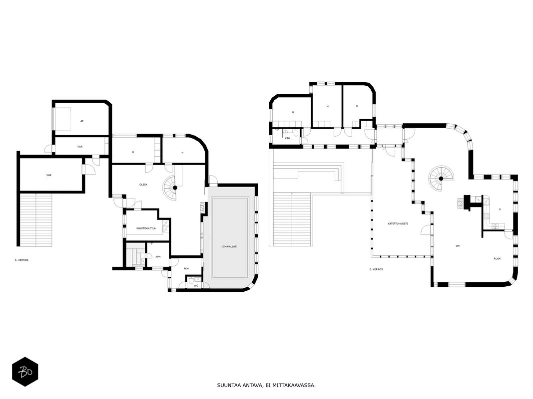 Alakerrassa on mm uima-allas, sauna ja takkahuone. Yläkerrassa sijaitsevat olohuone, keittiö ja kaunis ruokasali, jonka kaareva ikkunarivistö katsoo rannan suuntaan. Makuuhuoneita löytyy molemmissa kerroksissa.