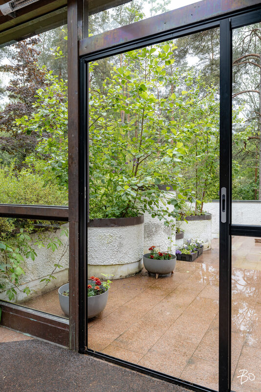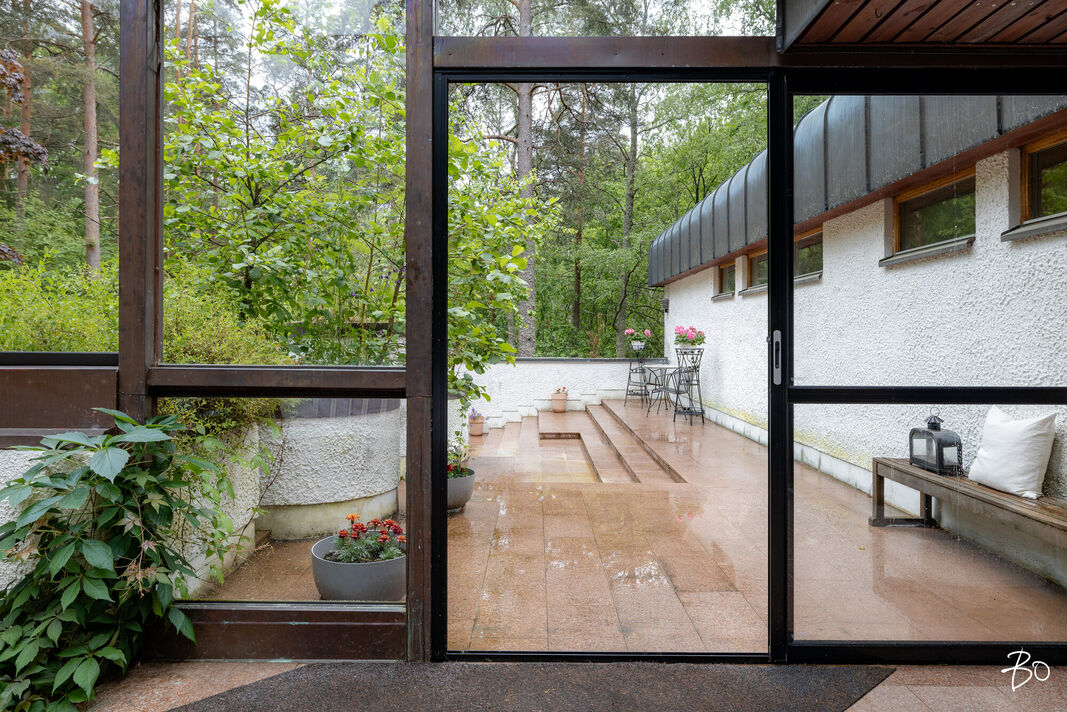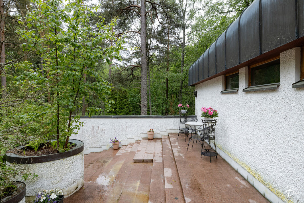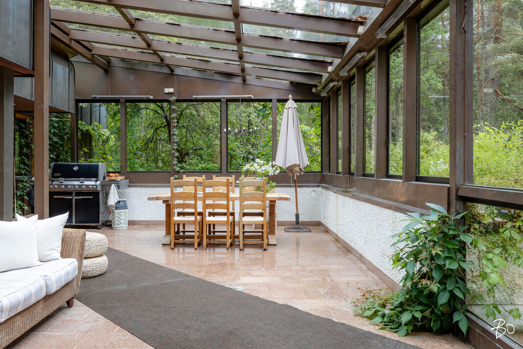 Suuressa talossa on hurmaavaa eteläeurooppalaista tunnelmaa. Talon katon reunat ovat kauniisti kaarevan muotoiset. Päärakennuksen seinissä on vaalea rappaus ja ikkunoissa puusepän tekemät tammikarmit. Tilavalla lasitetulla terassilla on graniittilaatoitus. Lattialämmitys lisää terassin käyttömukavuutta keväisin ja syksyisin.