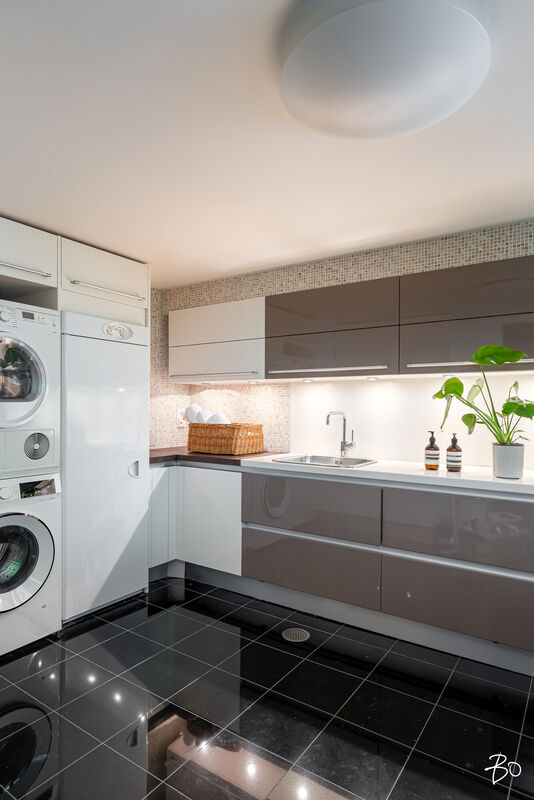 Varustus: pesukone, kuivausrumpu, kuivauskaappi, lattiakaivo