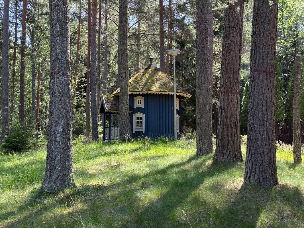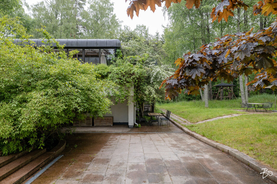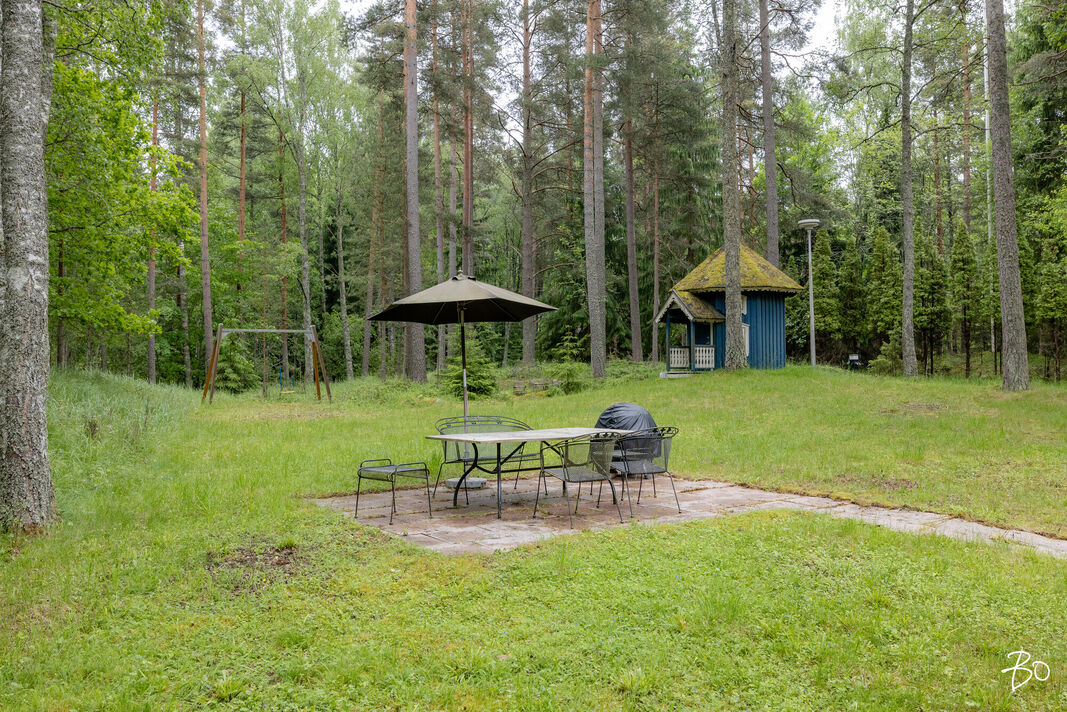 Piha-alueella on tenniskenttä ja kaksikerroksinen Muumitalo sekä pieni kaivettu lampi ylikulkusiltoineen.