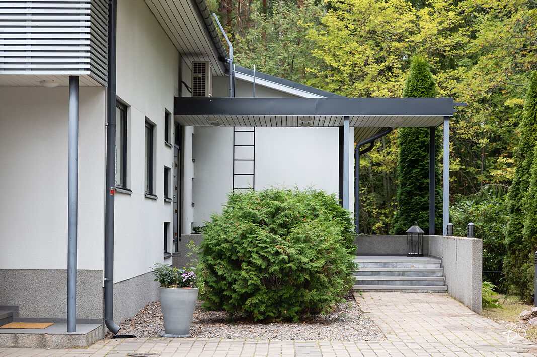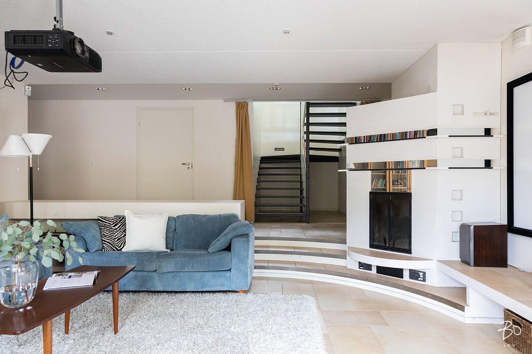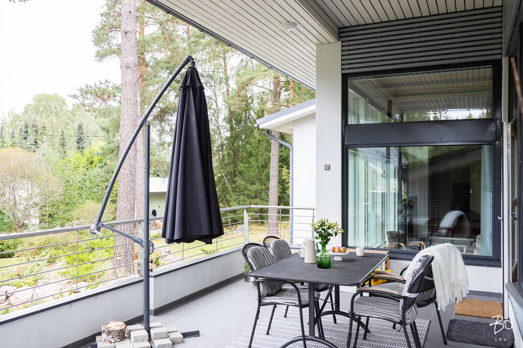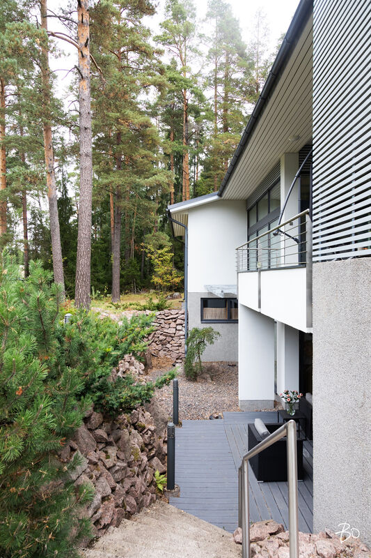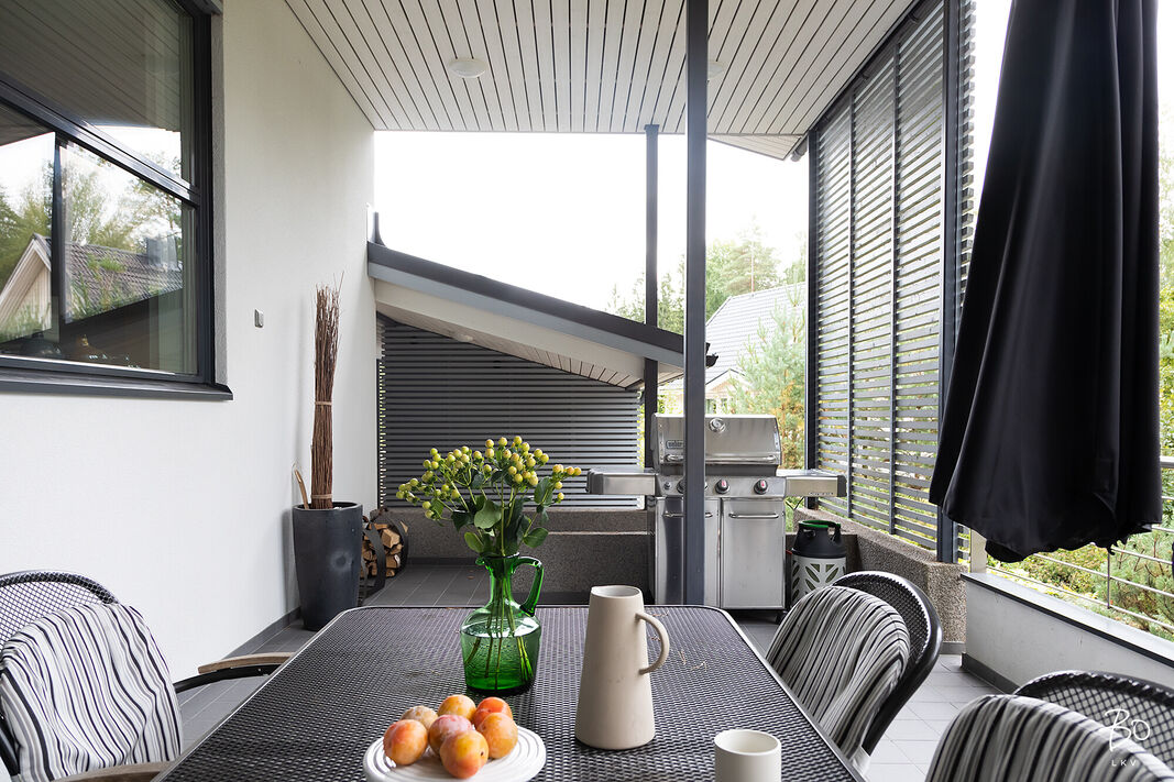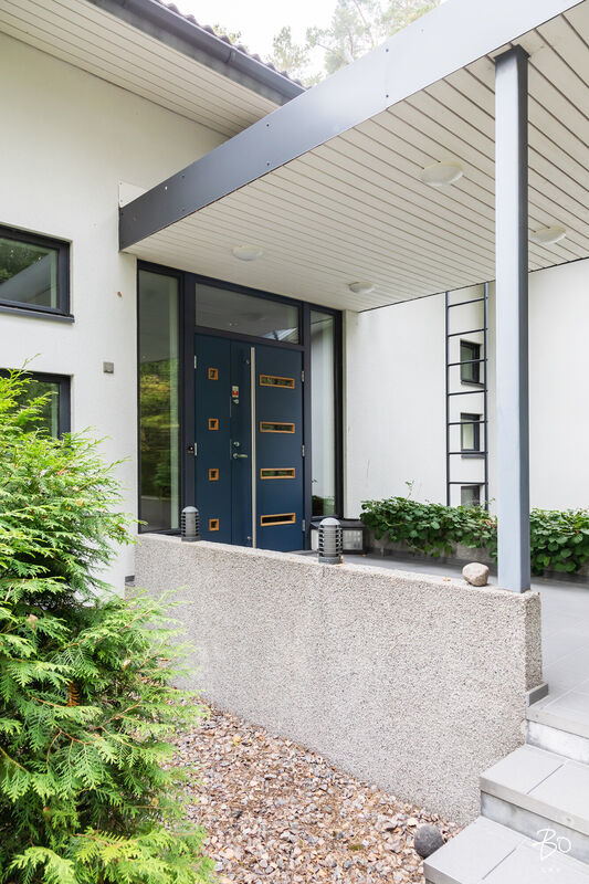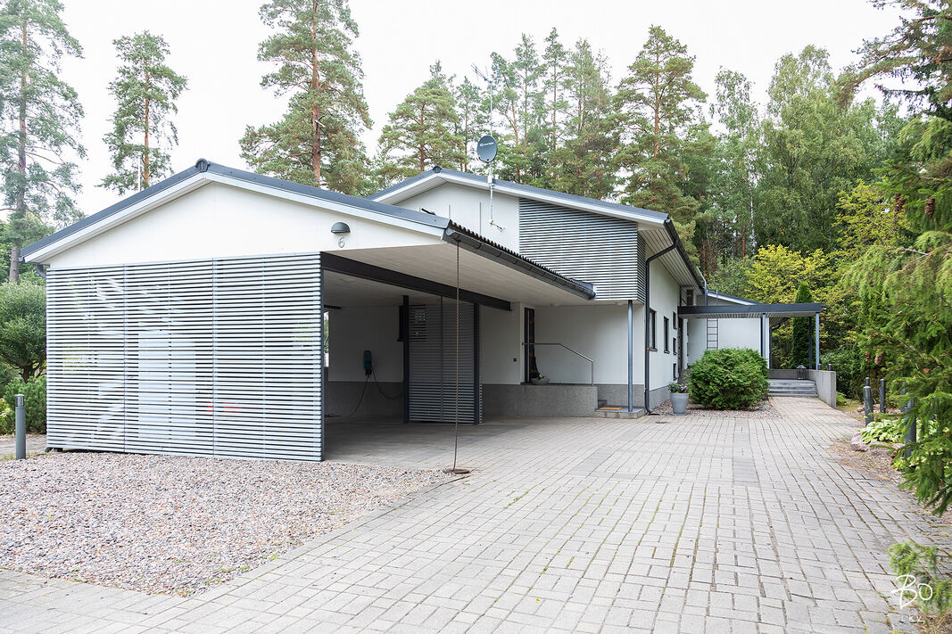 Tästä kokeneen arkkitehdin suunnittelemasta kodin yläkerrasta löytyy keittiö, avara ruokailu- ja olohuonetila, kodinhoitohuone omalla sisäänkäynnillä, 4-5 makuuhuonetta, kirjasto/työtila, pukeutumishuone, vaatehuone, 2 kylpyhuonetta, vieras wc, lasten leikkihuone ja tilava terassi. Alakertaan on myös oma sisäänkäynti ja iso kuntosalihuone, leffateatteri, wc, saunaosasto, tekninen tila, pikkuvarasto, vilvoitteluterassi ja viimeistelemätön melkein 100m2 kuiva kellarilämpöinen varastotila, joka mahdollistaa moneen. Ovet ovat normaalia leveämmät mm. pyörätuoleja varten ja portaisiin mahtuu asentamaan vaikka sisähissin. Tässä kodissa on todella paljon säilytystilaa. Lisäksi löytyy autokatos kahdelle autolle sähkölatauspisteellä, ulkovarasto, säilytyspaikka peräkärrylle ja talon toisella puolella löytyy tilaa myöskin vaikka veneen säilytykselle.
