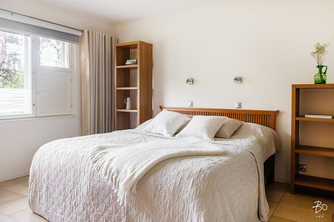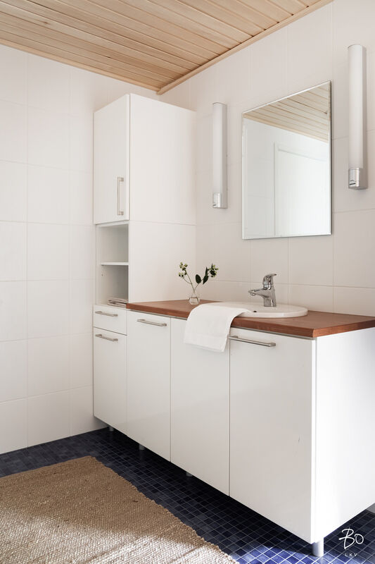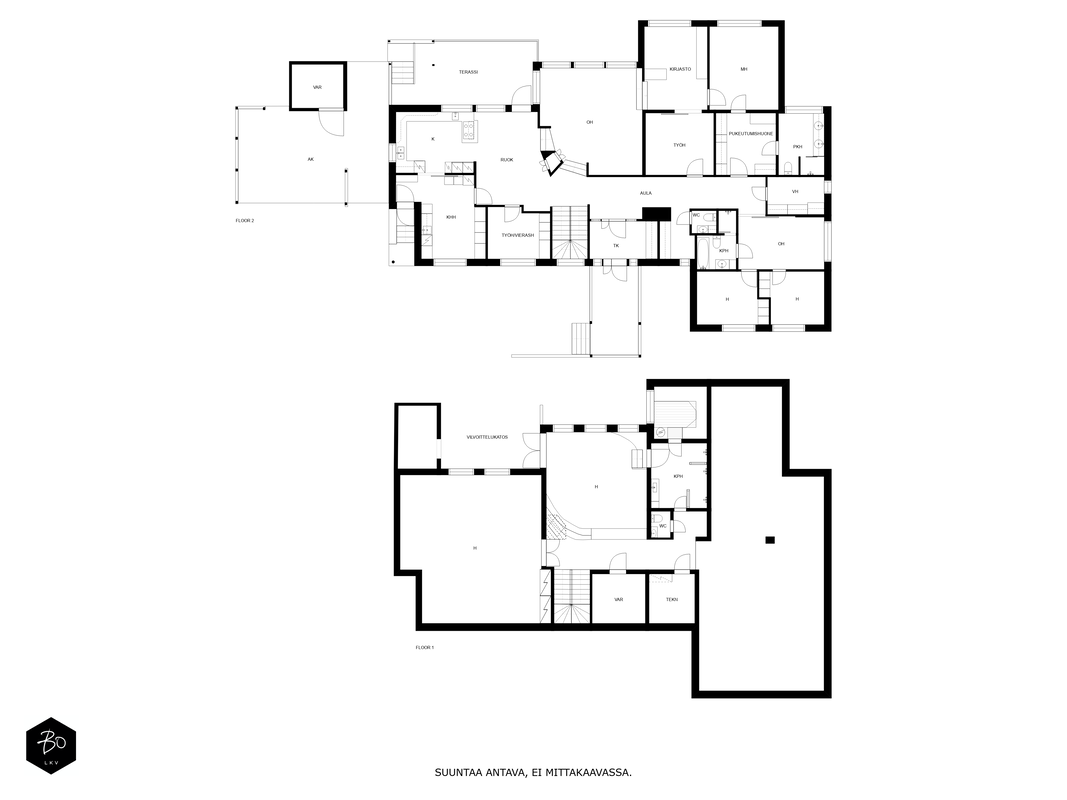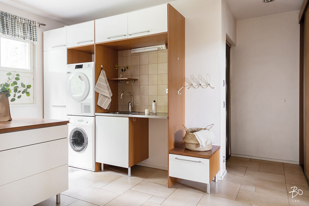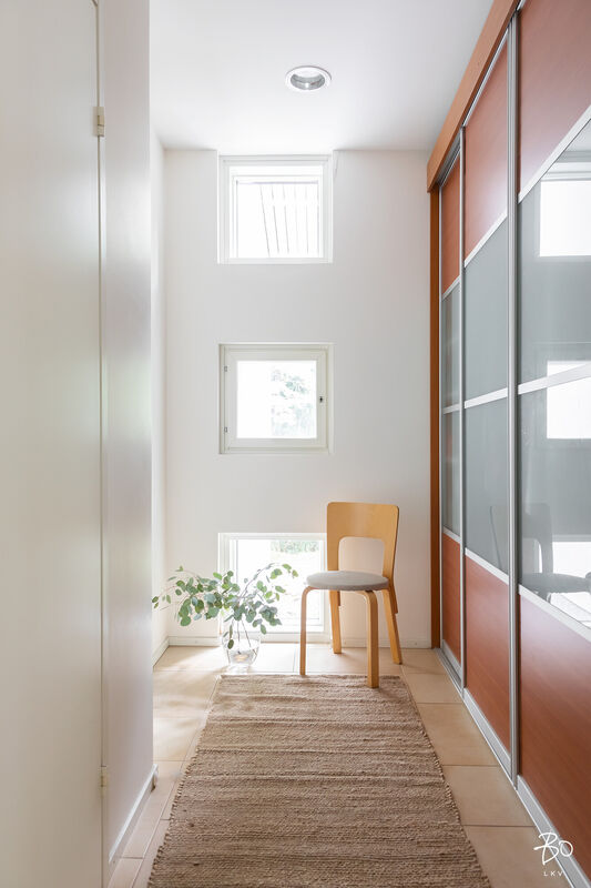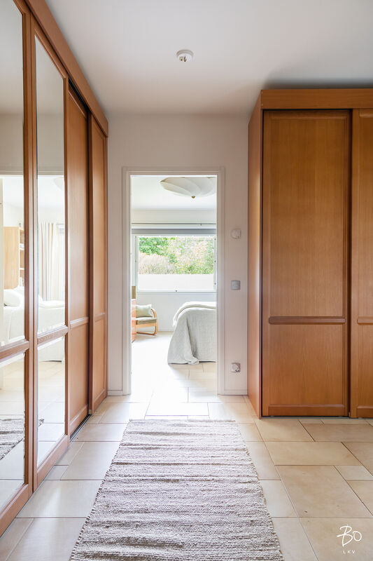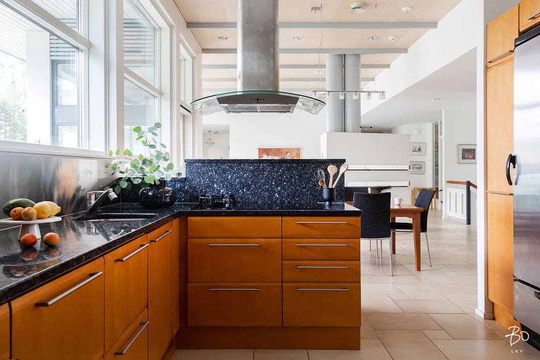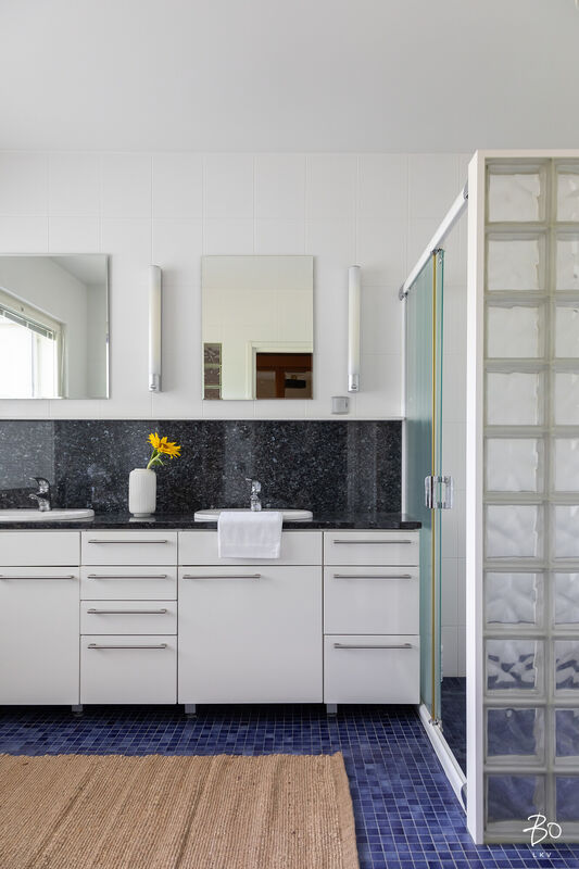 Tästä kokeneen arkkitehdin suunnittelemasta kodin yläkerrasta löytyy keittiö, avara ruokailu- ja olohuonetila, kodinhoitohuone omalla sisäänkäynnillä, 4-5 makuuhuonetta, kirjasto/työtila, pukeutumishuone, vaatehuone, 2 kylpyhuonetta, vieras wc, lasten leikkihuone ja tilava terassi. Alakertaan on myös oma sisäänkäynti ja iso kuntosalihuone, leffateatteri, wc, saunaosasto, tekninen tila, pikkuvarasto, vilvoitteluterassi ja viimeistelemätön melkein 100m2 kuiva kellarilämpöinen varastotila, joka mahdollistaa moneen. Ovet ovat normaalia leveämmät mm. pyörätuoleja varten ja portaisiin mahtuu asentamaan vaikka sisähissin. Tässä kodissa on todella paljon säilytystilaa. Lisäksi löytyy autokatos kahdelle autolle sähkölatauspisteellä, ulkovarasto, säilytyspaikka peräkärrylle ja talon toisella puolella löytyy tilaa myöskin vaikka veneen säilytykselle.