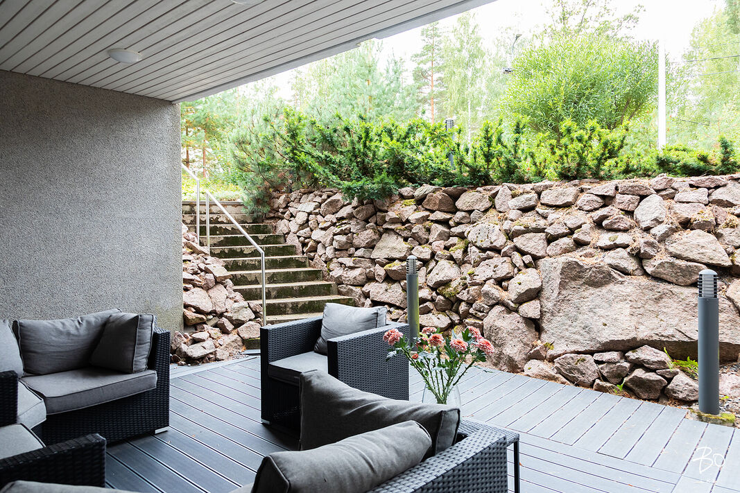 Aivan vierestä löytyvät hyvät ulkoilumahdollisuudet mustikkametsineen. Terassilla saat nauttia töiden jälkeen iltapäivä/ ilta-auringosta. Hyvin hoidetulla nurmikolla mahtuu pelaamaan vaikka jalkapalloa isommallakin porukalla.