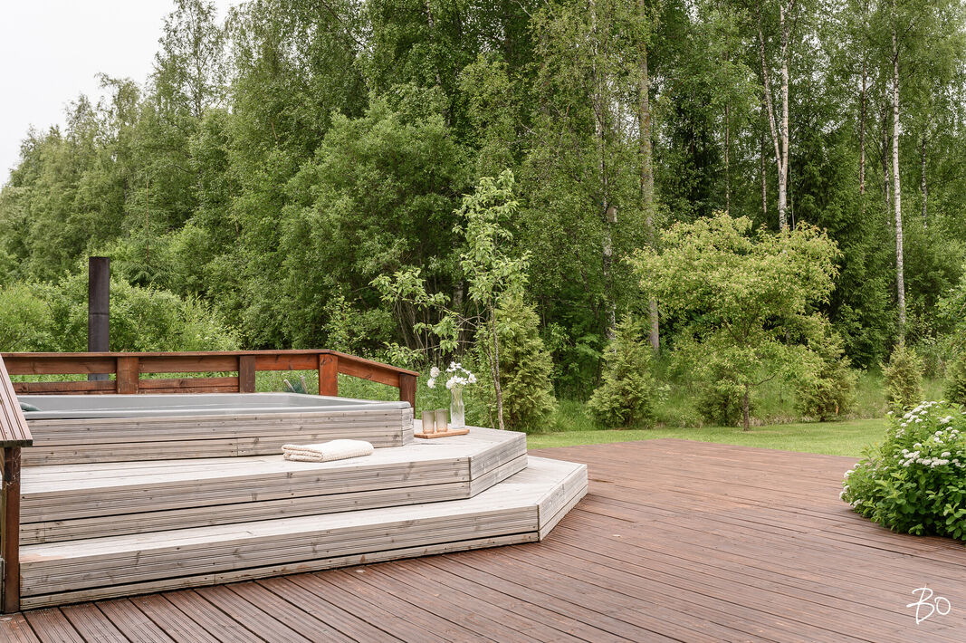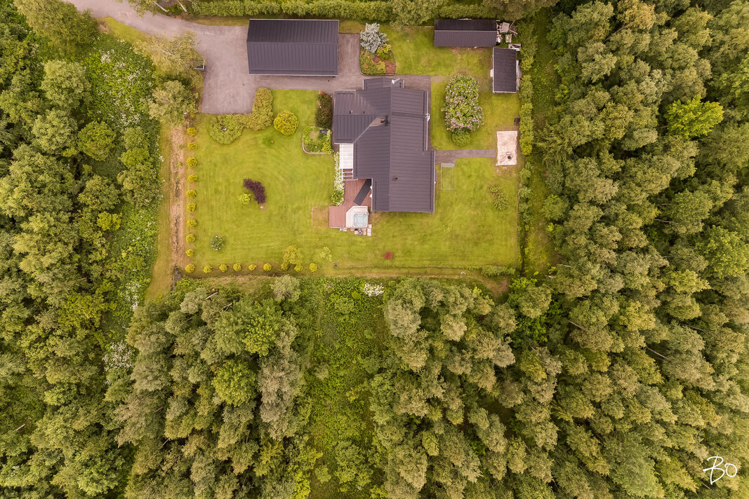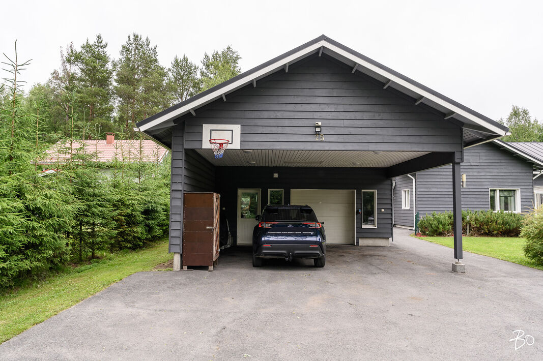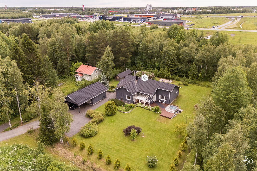 Talo sijaitsee yli 1700 neliön puistoon rajoittuvalla omalla tontilla. Pihapiirissä on lisäksi lämmin autotalli, jonka yhteydessä on autokatos. Pihapiirissä on myös puuliiteri sekä pihavaja. Pihassa on runsaasti istutuksia ja lopputulos onkin erittäin viihtyisä. Reilun kokoisen terassin kruunaa kiinteä palju. Talon lämmitys on hoidettu modernilla vesi-ilmalämpöpumpulla sekä vesikiertoisella takalla.