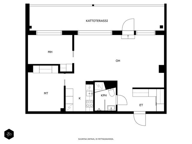 Asunnon 64 m² jakautuvat fiksusti 2-3 huoneeseen ja keittiöön, ja kruununa toimii harvinaisen suuri, noin 20 m² etelään avautuva lasitettu terassi. Pohjaratkaisu toimiikin mainiosti esimerkiksi aktiivisen pariskunnan tai pienen perheen arjessa.
