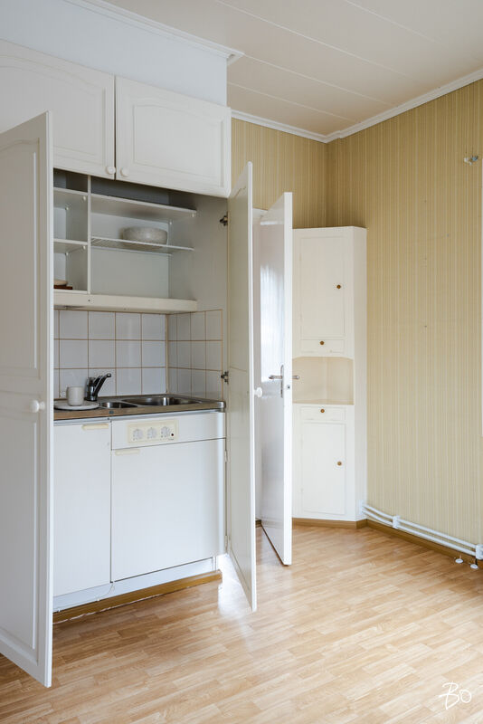 * Toisen kerroksen asunto: 2 huonetta, eteinen, keittokomero, kylpyhuone