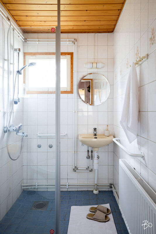 Toisessa kph on pieni 5x5 laatta, pesukoneliitäntä, poreamme ja wc.
