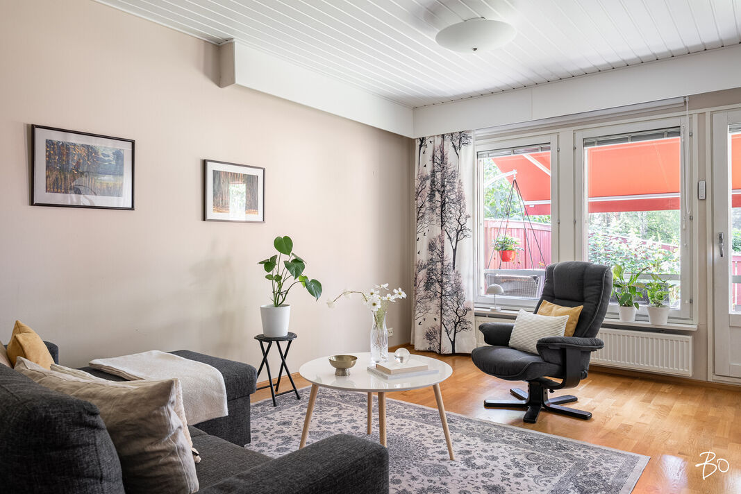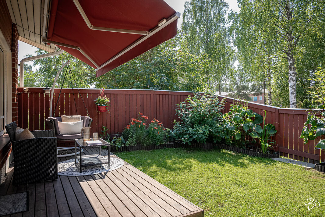 Etu- ja takapiha on hoidettu huolella ja tarjoavat erinomaiset puitteet rentoutumiseen ja kesästä nauttimiseen. Molemmilla pihoilla on omat terassit, ja aidattu takapiha tuo yksityisyyttä. Sähkökäyttöinen markiisi lisää käyttömukavuutta ja suojaa auringolta kuumina päivinä. Hyvin hoidettu taloyhtiö tekee asumisesta huoletonta - viimeisimpänä on toteutettu laaja pihasaneeraus, jossa uusittiin sade- ja hulevesijärjestelmät sekä asfaltoinnit. Asunnolle kuuluu sähköpistokepaikka.