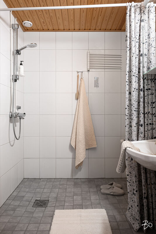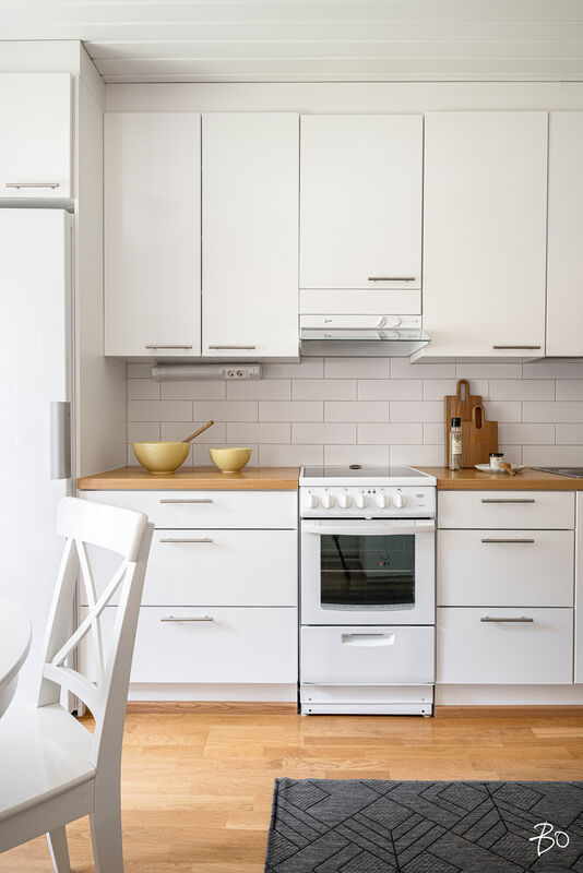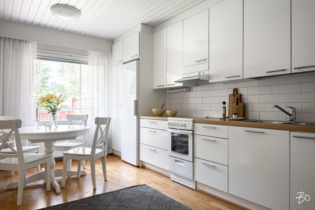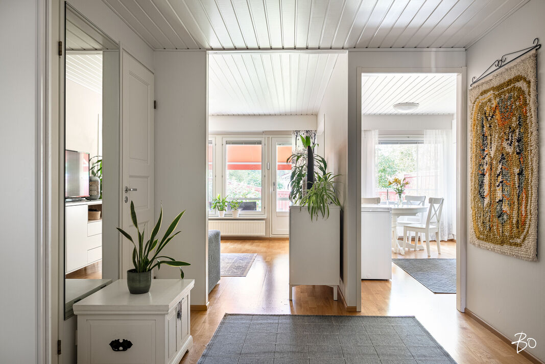 Tämä 65,5 m² kaksio hurmaa avaruudellaan ja valollaan. Asunto on remontoitu arvioltaan n. 2010 aikana ja pidetty siistissä kunnossa. Neutraali ja ajaton sävymaailma tekee kodista helposti sisustettavan. Selkeälinjainen keittiö tarjoaa toimivat puitteet ruoanlaittoon, ja pesukoneelle on järjestetty kätevä paikka wc-tilaan. Kylpyhuone ja kodin pinnat ovat siistit ja hyvässä kunnossa, viimeisimpänä ehostuksena juuri asennettu laminaattilattia makuuhuoneeseen ja vaatehuoneeseen (kuvissa näkyy aiempi muovimatto). Säilytystilaa löytyy runsaasti makuuhuoneen kaapistoista, vaatehuoneesta sekä etupihalla sijaitsevasta ulkovarastosta.