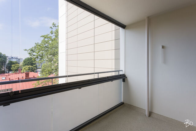 Isolle lasitetulle parvekkeelle pääsee nauttimaan kahvikupillisesta ja upeista kattonäkymistä. Skandinaavinen tyyli ja laadukkaat materiaalit luovat elegantin ja ajattoman kokonaisuuden, jossa jokainen yksityiskohta on loppuun asti harkittu.